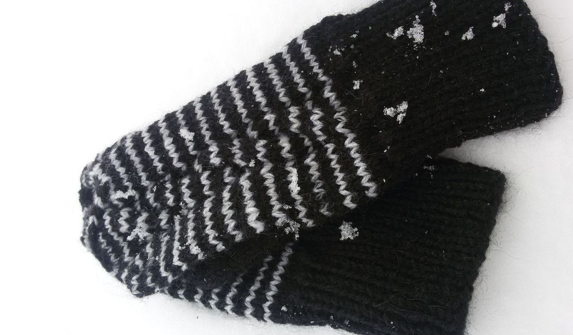 Черные шерстяные варежки в серую полоску, прекрасно впишутся в городской стиль. Объемные и теплые рукавицы связаны из мягкой пряжи.