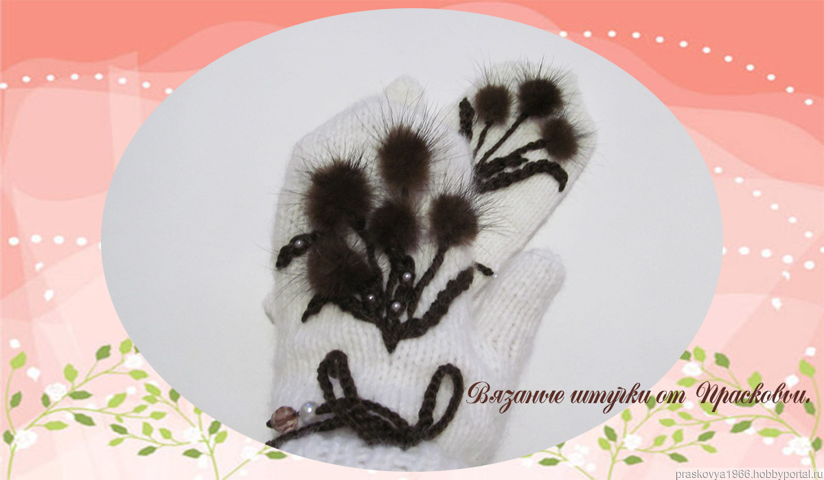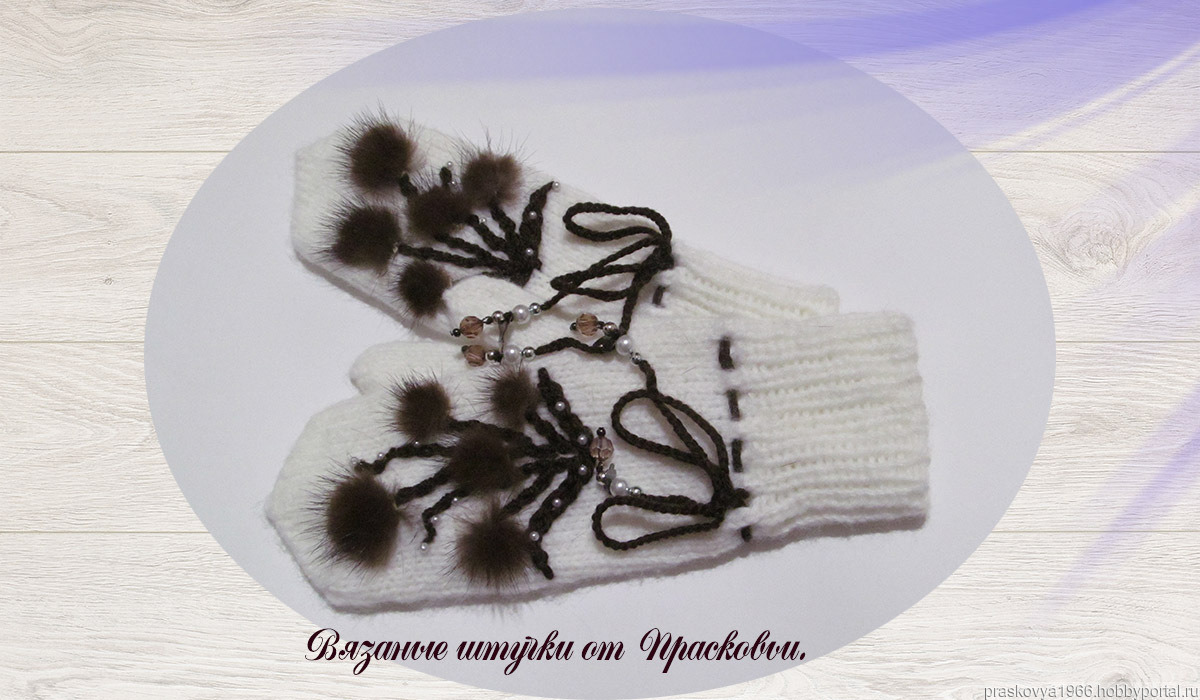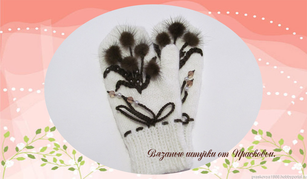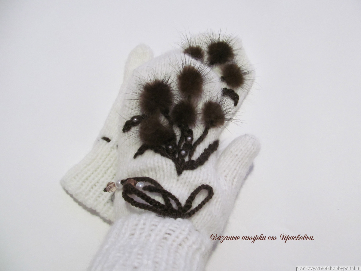 Варежки украшены бусинами и натуральным мехом.