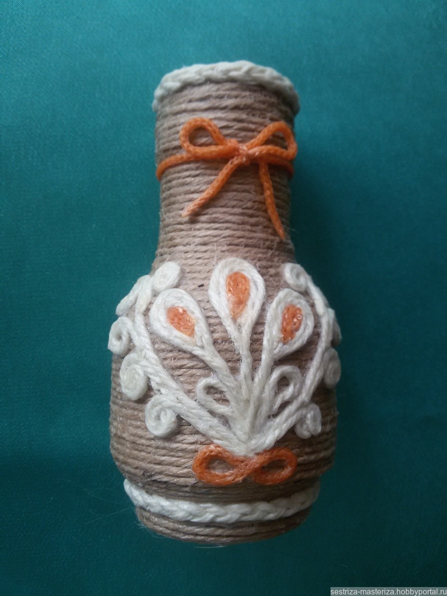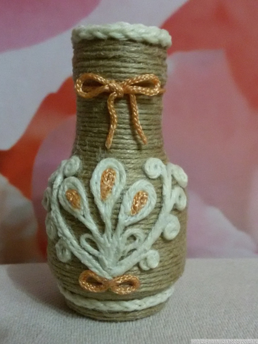 Небольшая, изящная вазочка выполнена из джутового шпагата в технике джутовая филигрань. Покрыта акриловым лаком, не боится влаги. Прекрасный подарок, украсит любой интерьер.