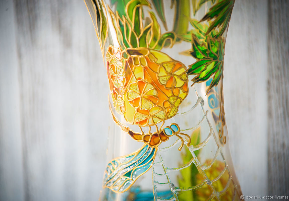Ваза подарочная с витражной росписью Одуванчики. Ваза расписана витражными красками Vitrail с применением глиттеров и жидкого стекла. Станет отличным подарком и украшением интерьера! Наполнит дом весенним светом и ароматов одуванчиков!