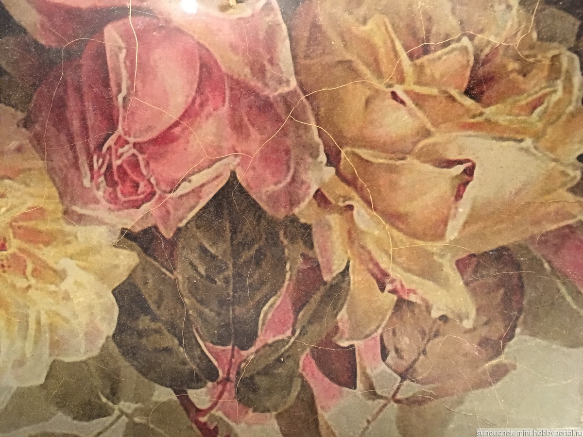 Декорирована в винтажном стиле, нанесен тонкий кракелюр( золотые трещинки).