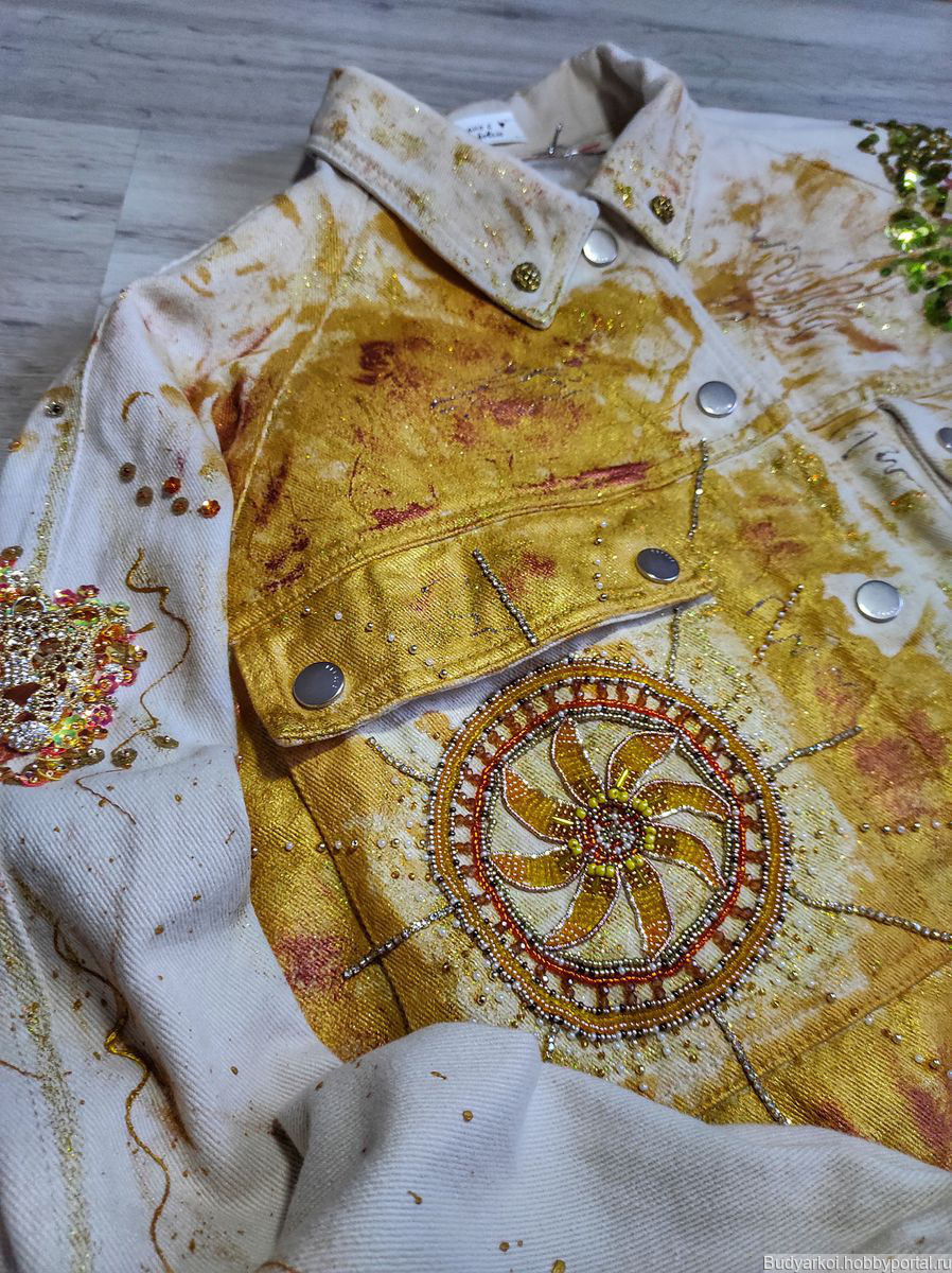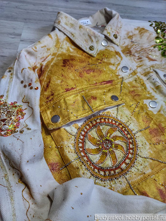 На куртке выполнена роспись красками по ткани, вышивка бисером, пайетками, стразами и кристаллами. Всё прочно пришито на мононить. С изнаночной стороны куртки нет никаких ниток.