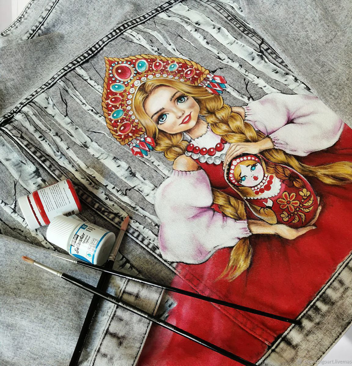 джинсовая куртка с рисунком Русская красавица и матрешка, Ручная роспись кастом