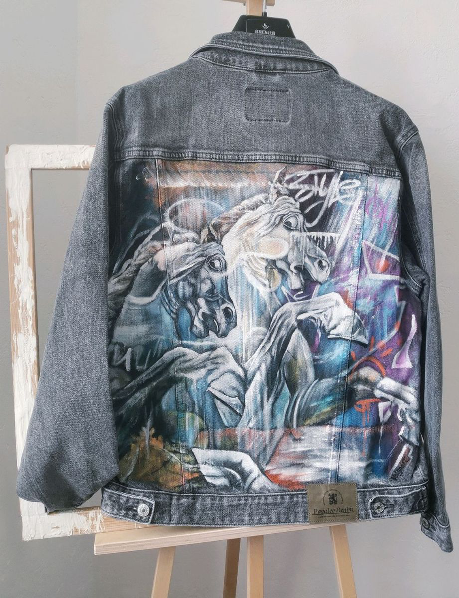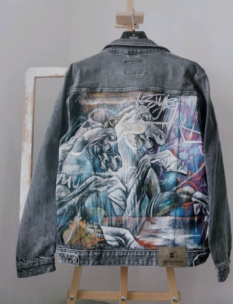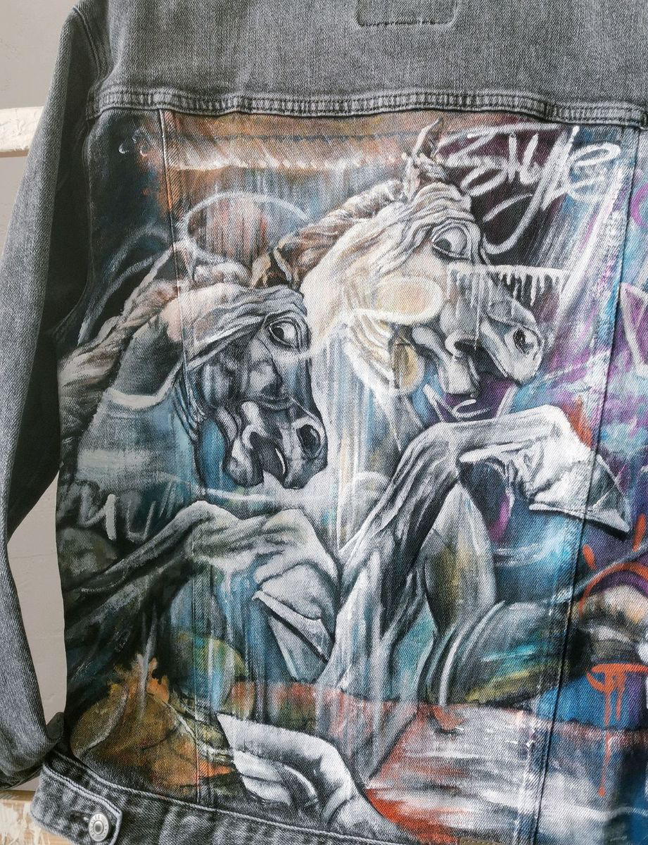 авторская работа, ручная работа, одежда, подарок, стиль, стильный, уникальный подарок, ручная авторская работа, конь, уличная мода, авторский дизайн, унисекс, джинсовый стиль, стильный подарок, куртка, молодежная мода, молодежный стиль, ручная роспись, куртка женская, джинсовая куртка, арт, куртка с росписью, куртка джинсовая, граффити, джинсовая куртка купить, кастом, кастомизация