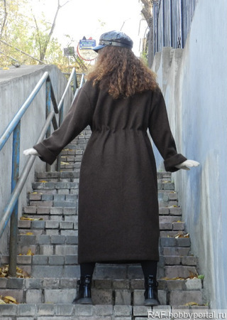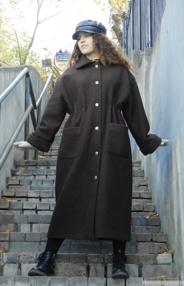 Пальто - оверсайз с накладными карманами и кулисой по линии талии. Застёжка на кнопки, по низу рукава отложная манжета.