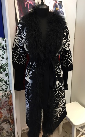 Вязаное на машине пальто, с отделкой - мех ламы. 100%шерсть