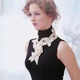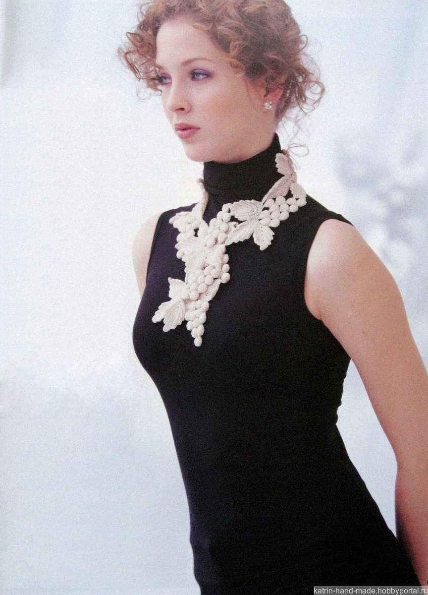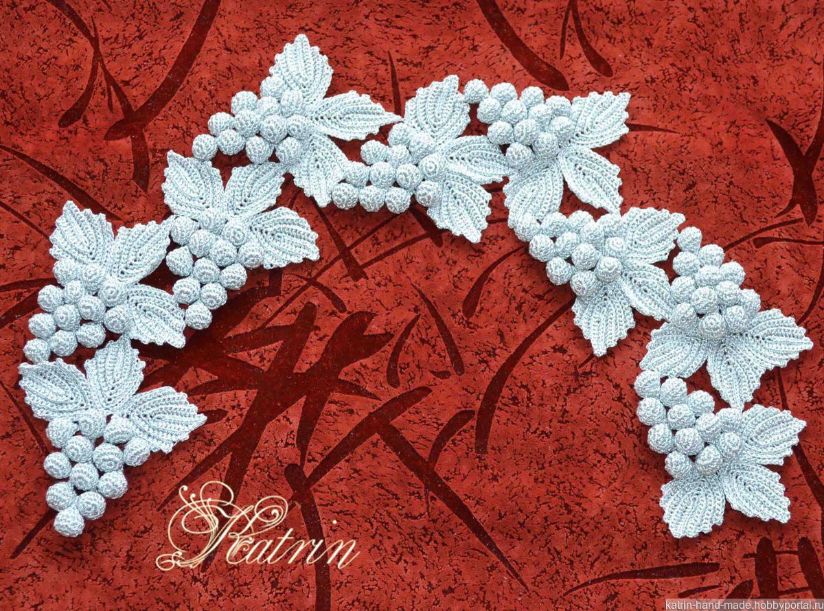 Воротник «Виноградная лоза» ручной работы, связан крючком из качественной турецкой пряжи: полиамид-80%, полиэстер-20%. Размер изделия 62x10 см. Работа выполнена в технике ирландского кружева в серебристом варианте. «Виноградная лоза» прекрасное дополнение к однотонному изделию или просто оригинальное украшение на шею.