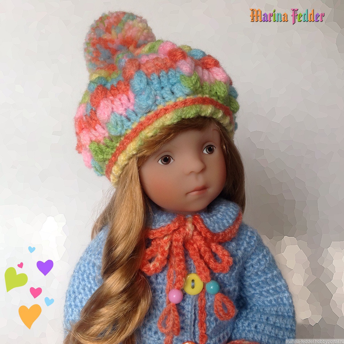 Комплект связан крючком. Это базовая модель. На этого основании расчета можно связать куртку, свитер и дугие вещи кукольного гардероба, а также множество шапочек разных цветов.