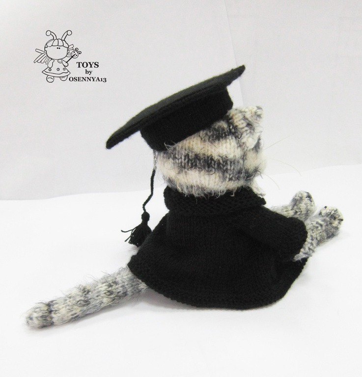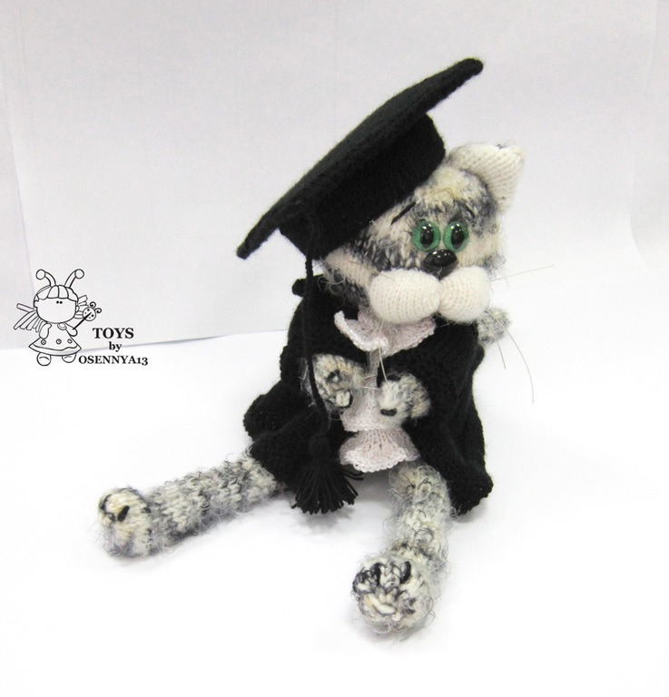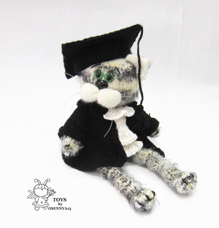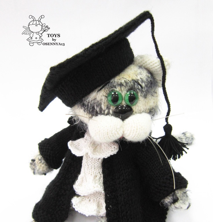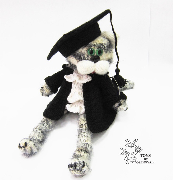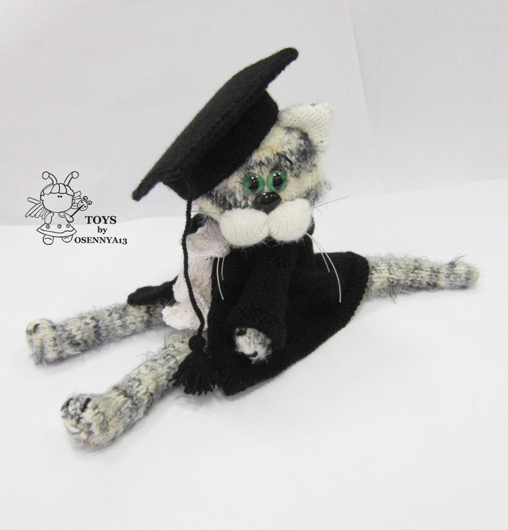 Мастер класс содержит пошаговое описание с фотографиями( более 80 штук), как связать этого ученого кота, мантию, жабо и шляпу.