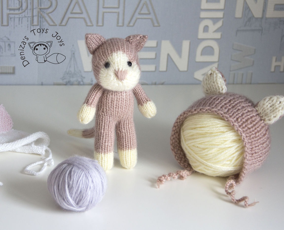 вязаная игрушка, кошка, для новорожденного, Для самых маленьких, вязание спицами, мастер-класс, бледно-розовый, мк в формате pdf, описание, шапочка с ушками, Киска, описание игрушки, аксессуары для фотосессий, мк кот