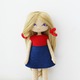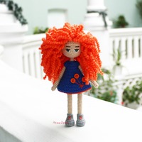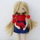 Включает в себя описания вязания тела куклы, платья, обуви, вышивку глаз и крепление волос.