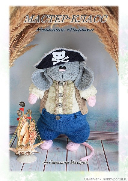 Пираты! Дух свободы и бунтарства! Кто из нас в детстве не любил их? А кому не понравится этот ласковый добрый Мышонок, он же Капитан, он же Пират? По данному мастер-классу у Вас получится толстый, упитанный, с чистой душой и открытым сердцем Мышонок ? , ростом 34 см и объемом талии 52 см. Сидеть он не умеет, а вот постоять, если его уговорить, он согласится (только с опорой). Мышонок вяжется полностью крючком. Он полностью безопасен для деток (если заменить усы - леску на нить) и не имеет острых предметов. Одежда полностью съёмная и вяжется как крючком, так и спицами. Комплект одежды для Мышонка состоит из: красивой, молочного цвета блузы, украшенной кружевом; модных, синих брюк; очень приятной на ощупь жилетки и завершает весь образ широкополая пиратская шляпа с «черепушкой». ?