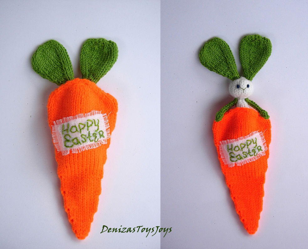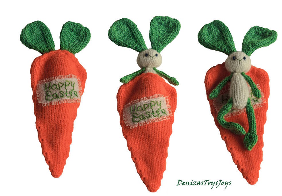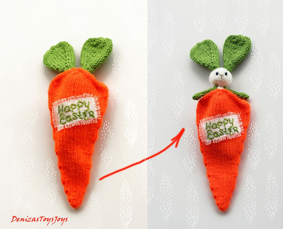 Мастер класс содержит пошаговое описание с фотографиями, как связать эту пасхальную шутку в виде зайца и пенала- морковки.