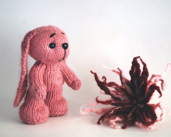 Игрушка связана лицевой гладью по кругу на 4-х носочных спицах.