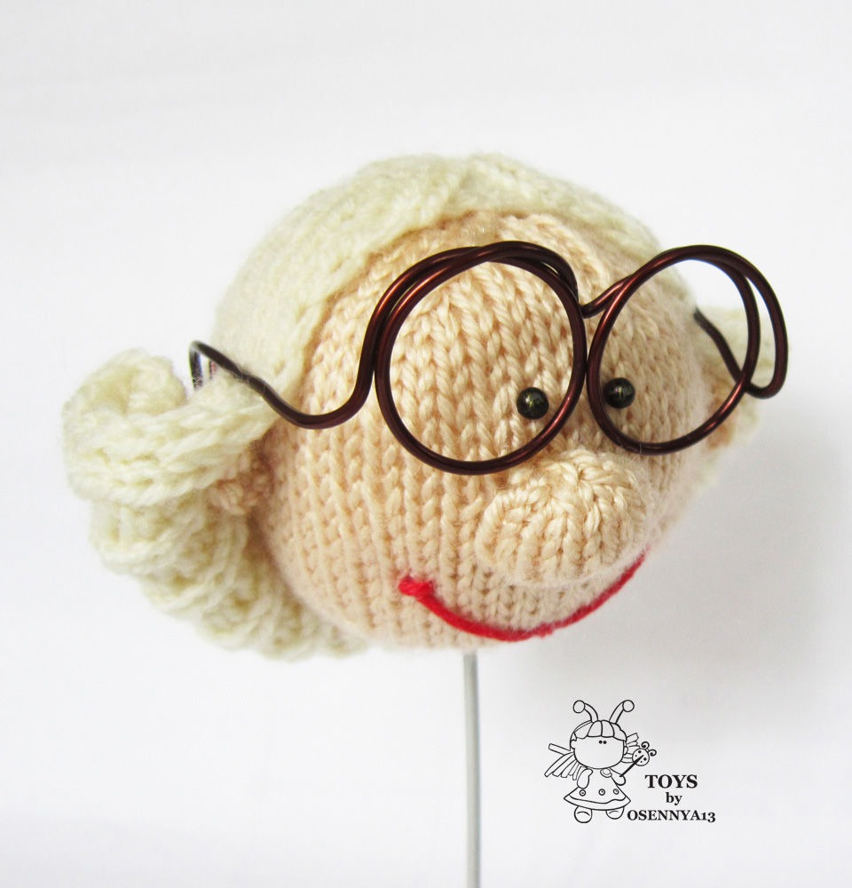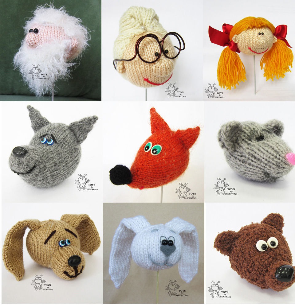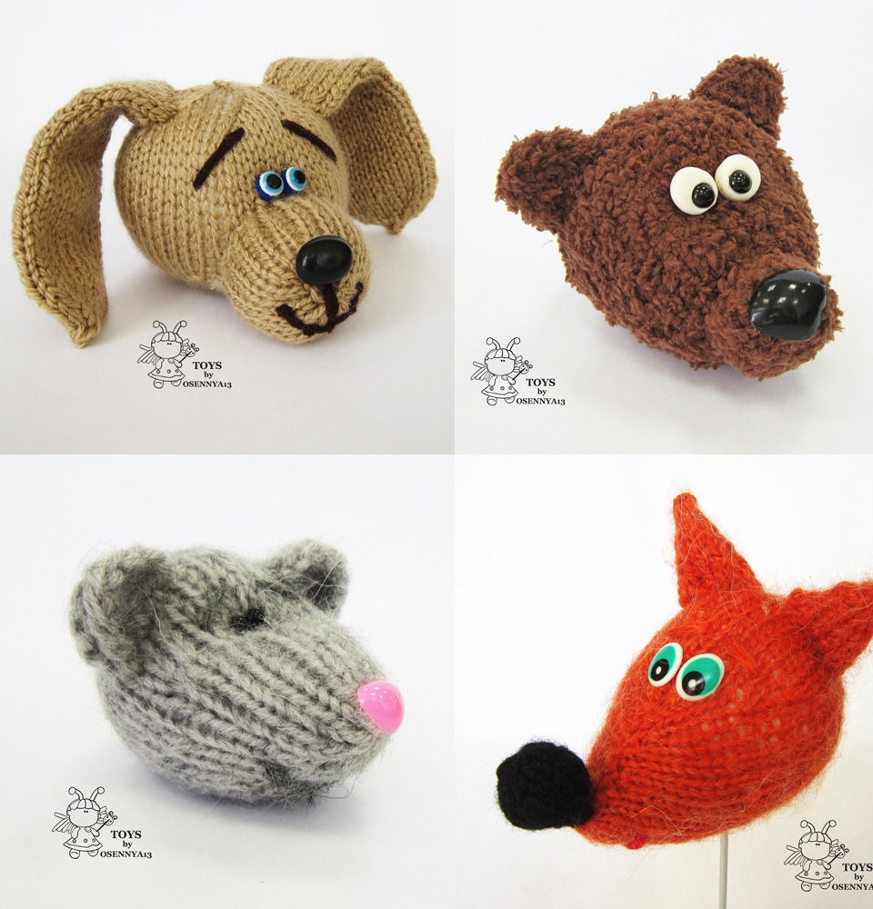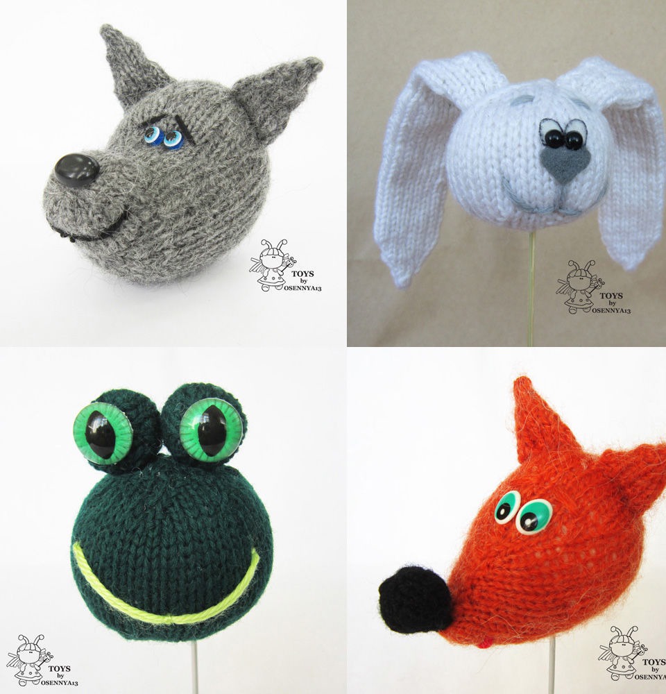 Вяжутся лицевой гладью. Крепятся к тыльной стороне перчатки при помощи пуговки или липучки или крепятся на палочку. Закрепляем палочку на 2-3 см внутрь головы.