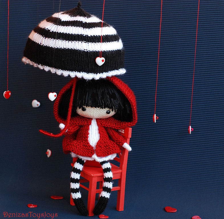 вязаная игрушка, вязаная кукла, авторская игрушка, вязание спицами, мастер-класс, день святого валентина, день влюбленных, описание, куколка, описание игрушки, описание куклы, вязаная спицами кукла, вязаная малышка, полосатые чулочки, куколка с зонтом, влюбленная кукла, полосатый зонт, черный красный белый, романтичная кукла
