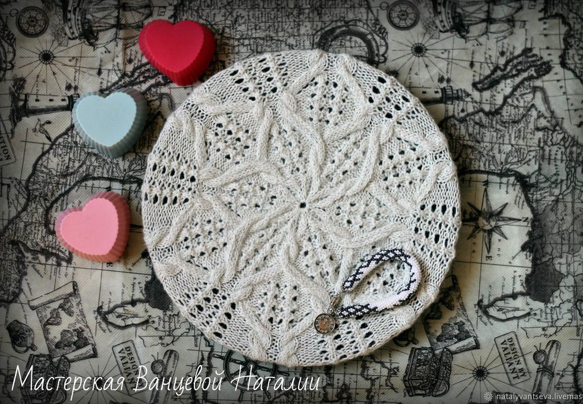 Название комплекта полностью оправдывает себя. Арановые переплетения волшебным образом складываются в эффектную макушку в форме снежинки. Берет имеет пышную форму за счет крупных аранов и ажурных дорожек.