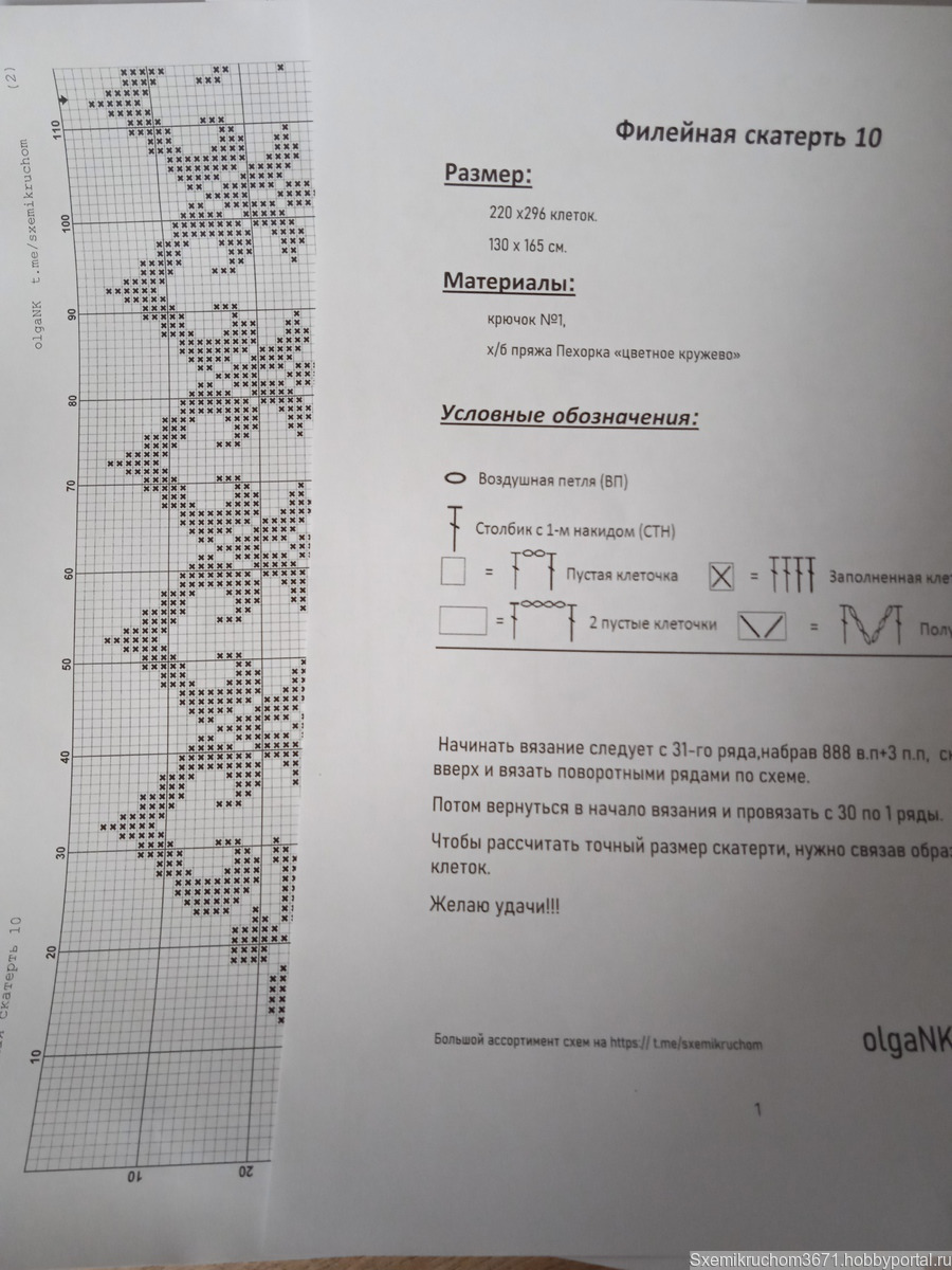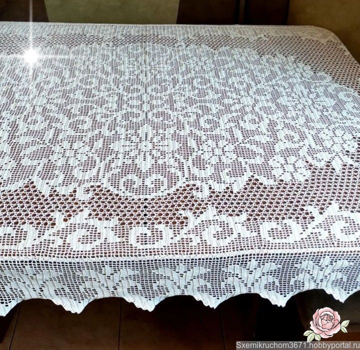 Размер скатерти 220 х 296 клеток или 130 х 165 см, окончательный размер изделия зависит от выбранных вами материалов и плотности вязания мастера.