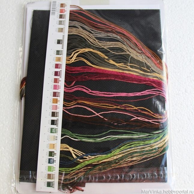 В набор входит черная Аида, канва 14 каунта, хлопковое мулине, игла, цветная, символьная схема, инструкция на английском языке.