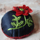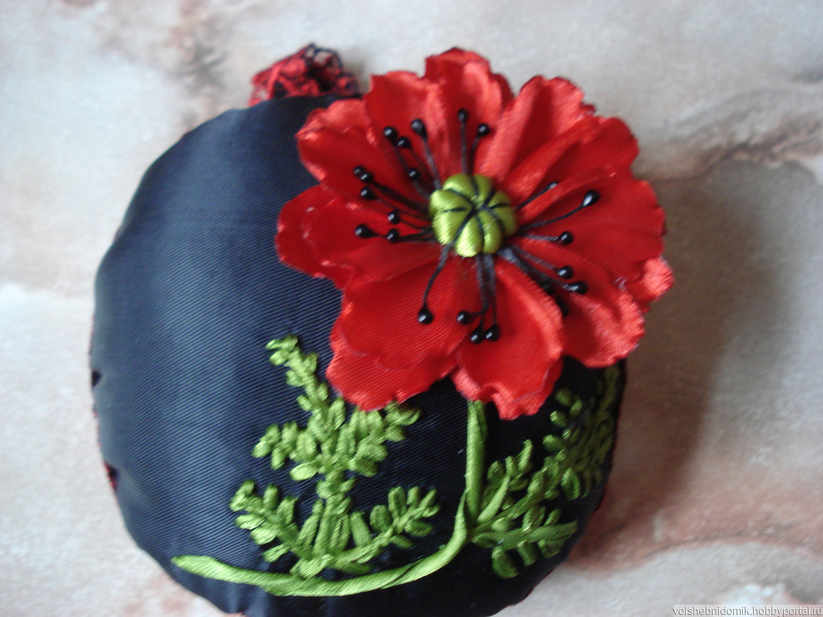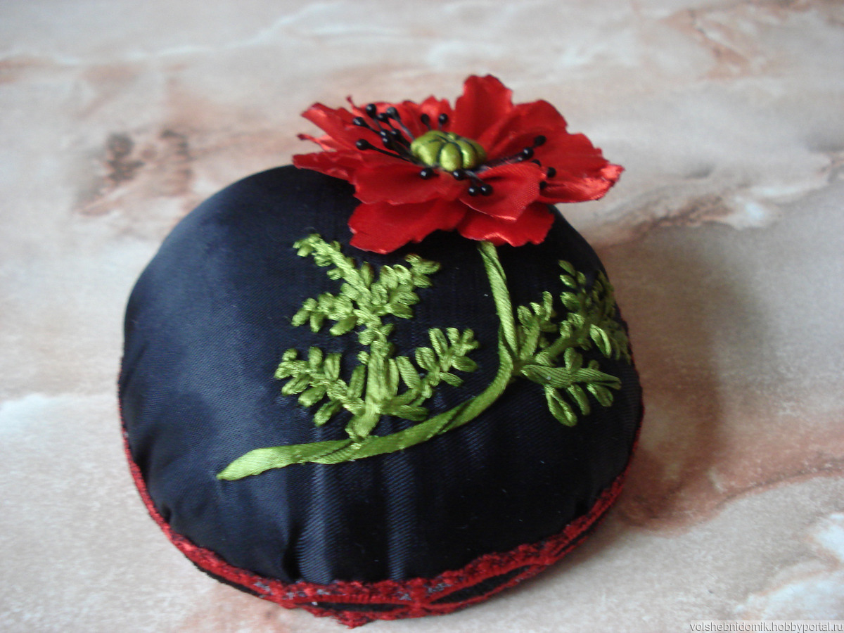 Игольница ручной работы с вышивкой мака атласными лентами. Отделка декоративной лентой.