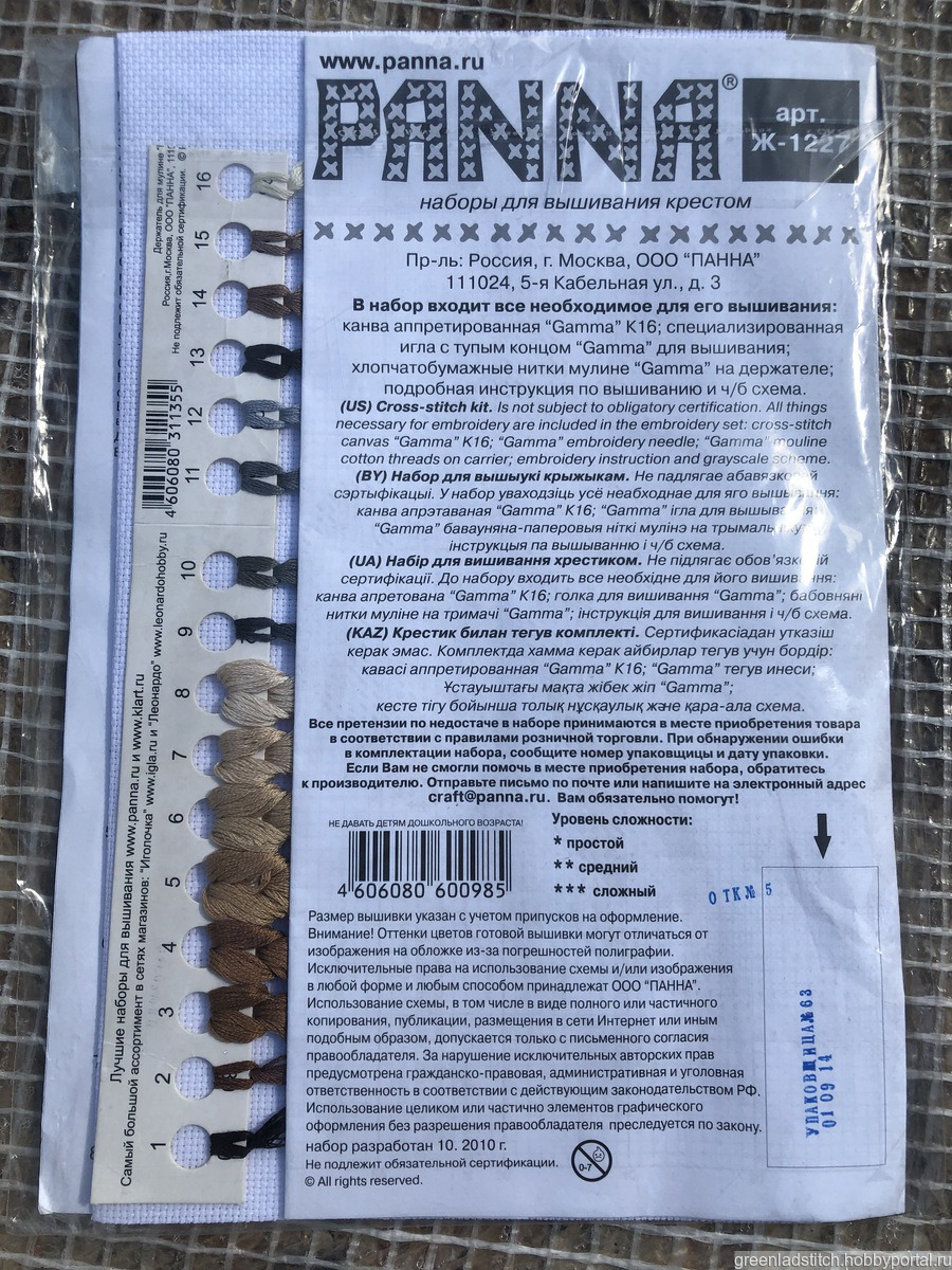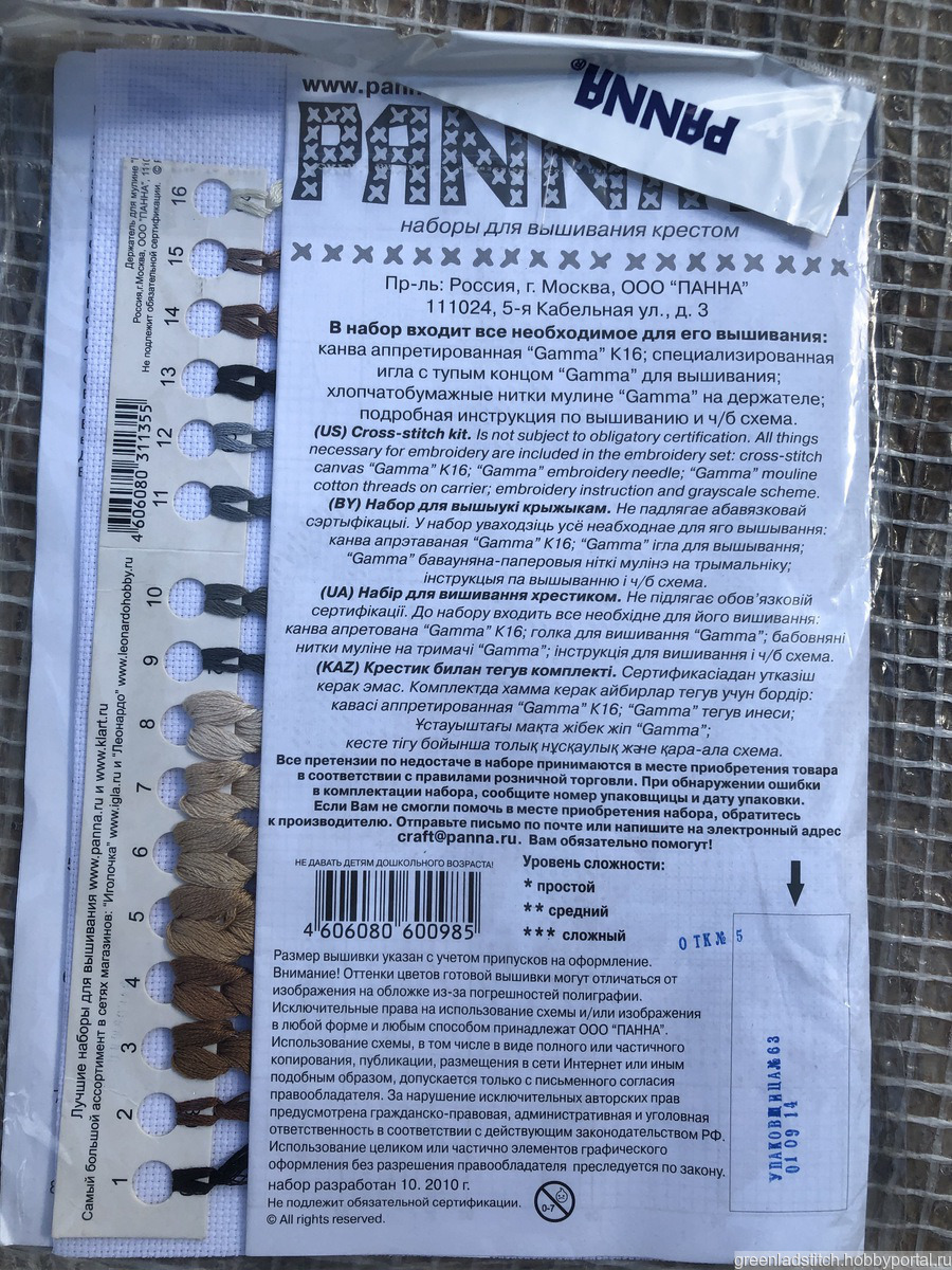 В набор входит все необходимое для его вышивания: канва аппретированная Gamma K16, специализированная игла с тупым концом, хлопчатобумажные нитки на держателе, подробная инструкция по вышиванию и ч\б схема.