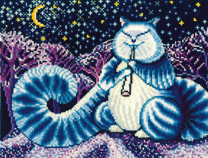 синий, кот, мулине, вышивка, подарок, вышивка крестиком, луна, крестик, канва, набор для вышивки, лунный кот, крестики