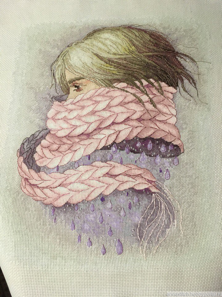 Размер 160х210 крестиков, 58 цветов DMC (в том числе 22 бленда). Виды стежков: крест (в 2 нити), полукрест (в 1 нить, фон), петит (глаза), бэкстич (в 1 и 6 нитей), французский узелок.