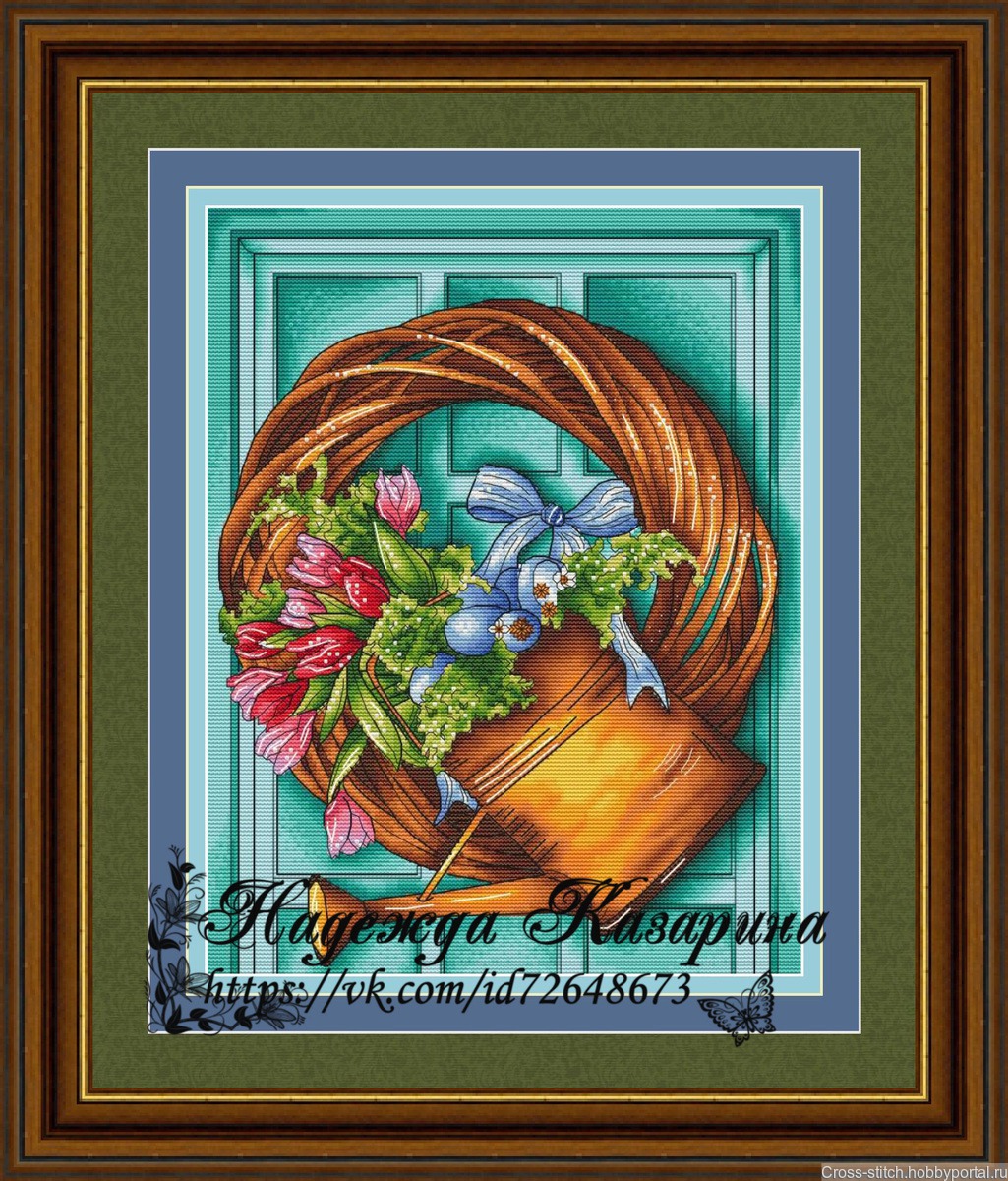 "Весенний венок" (по мотивам иллюстрации Юлии Щербаковой ) Размер 153 на 200 крестиков (25 на 32 см) 35 цветов. Цена 360 руб.