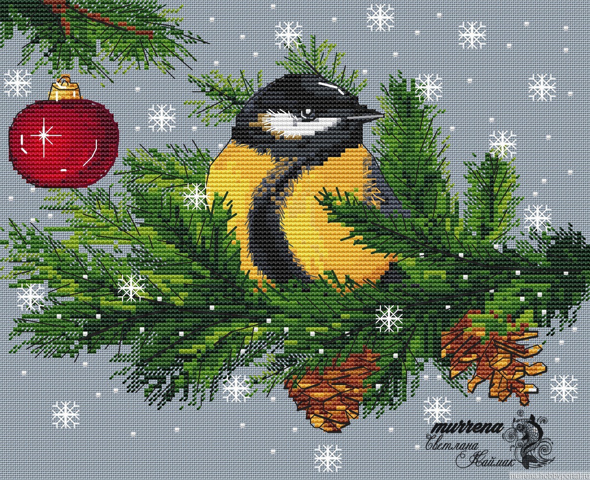 Вестница зимы по иллюстрации Валерии Алимовой 135х108 стежков, ДМС 21 цвет и 6 блендов из них, крест, полукрест 2-х направлений, бэкстич счетный. Зашив неполный, цвет канвы-оттенки голубого,серый.