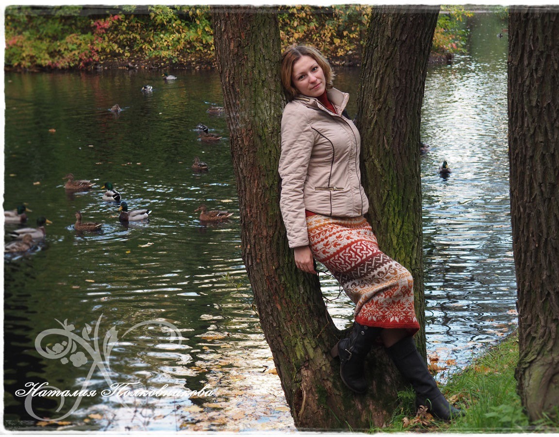 Юбка связана из знаменитой эстонской шерсти с добавлением полушерстяной пряжи . Она исключительно теплая , а жаккардовые узоры напоминают осенние солнечные дни.