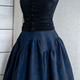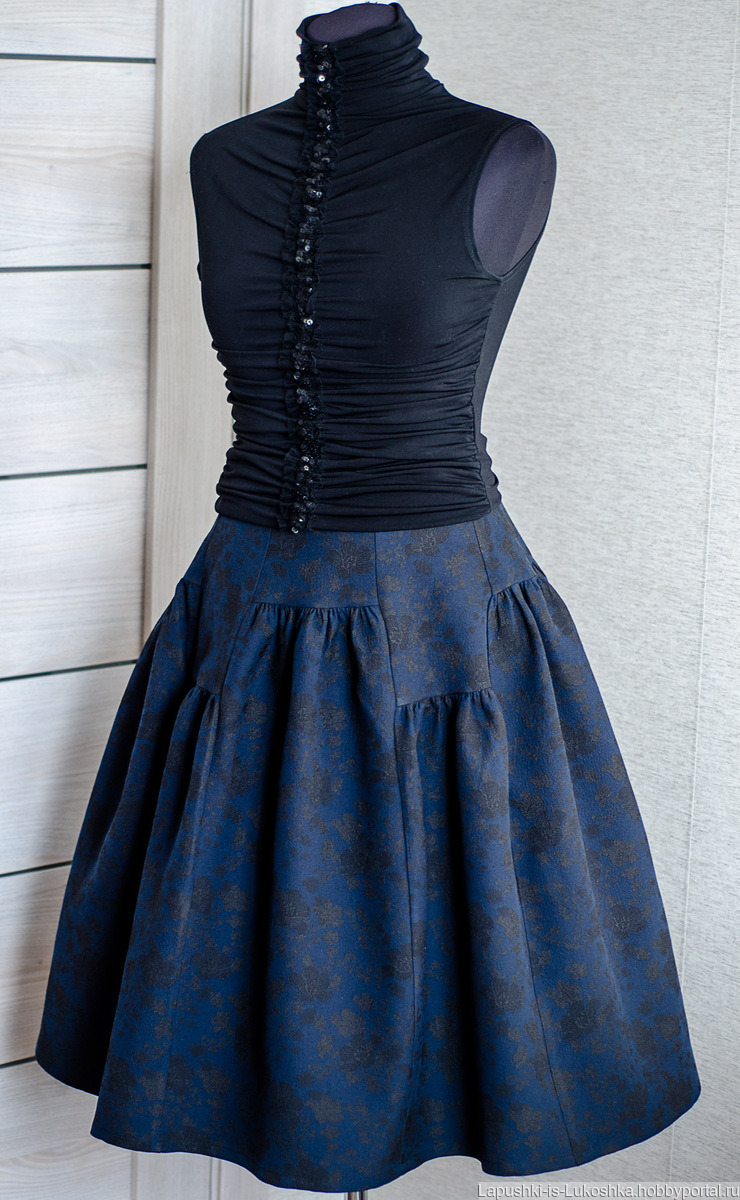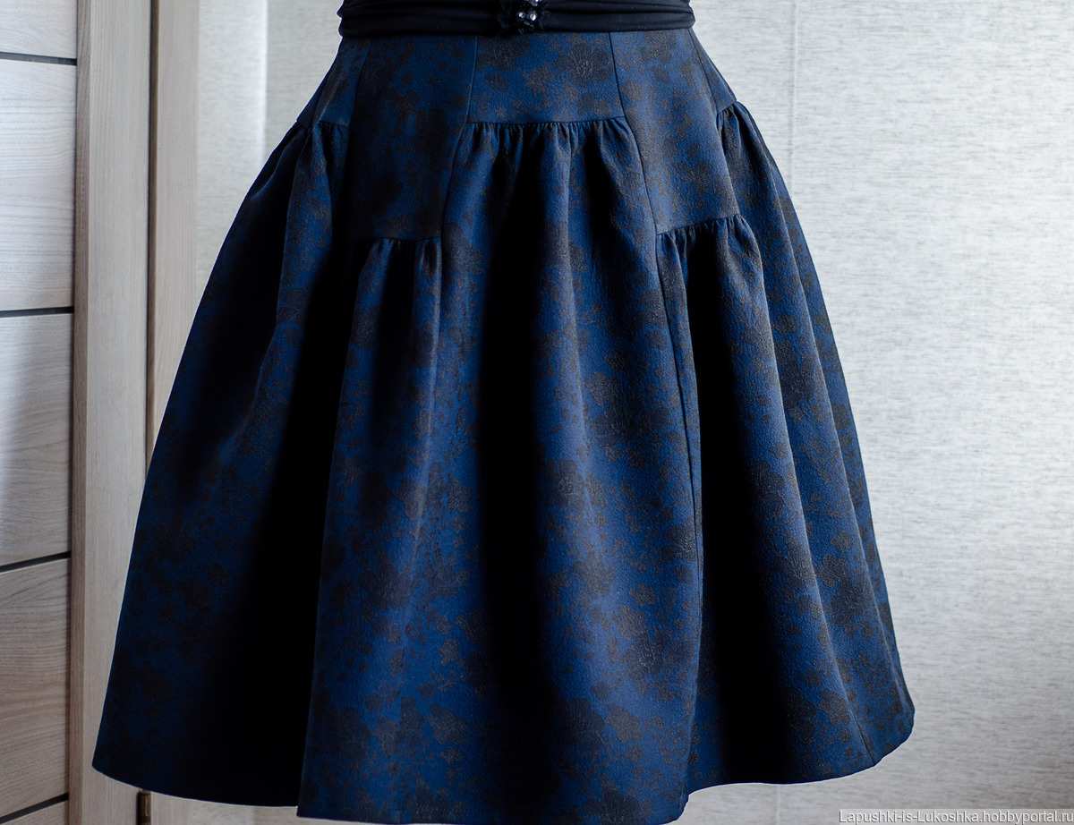 Та самая юбка, которая может стать самой любимой и востребованной в вашем гардеробе. Сшита из итальянского темно-синего жаккарда с рисунком из лаконичных цветов черного цвета. Разноуровневые сосборенные клинья на разрезной кокетке создают расклешенную форму и красиво подчеркивают талию. По талии- пояс, застегивается на молнию сбоку.