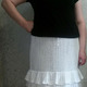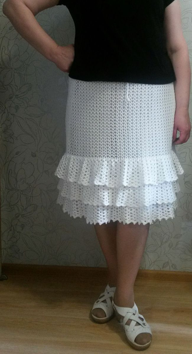 Имеет три оборки, связанные ажурные узором крючком, под оборками - филейная сетка, также связанная крючком.Белая юбка с оборками, связанная крючком создаст настроение и разнообразит ваш гардероб.