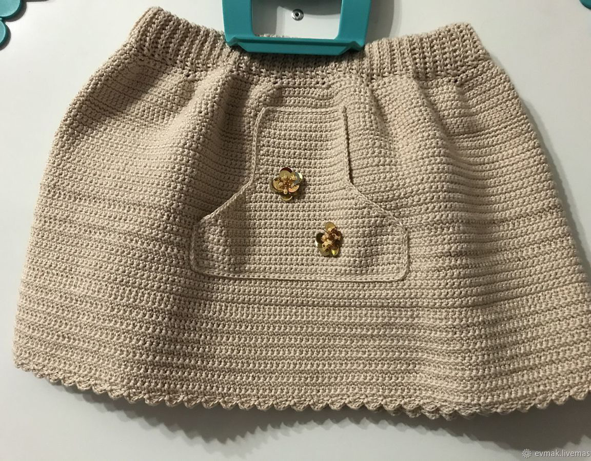Юбка связана крючком, имеет карман и украшения в виде цветков. Выполнена из вискозы и хлопка, материал дышащий и легкий. Очень комфортен в носке.