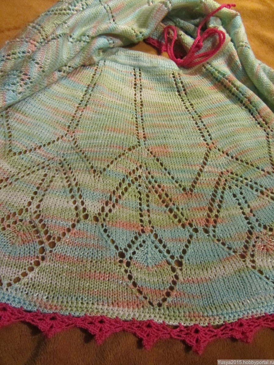 Авторская работа ,связана спицами,разноцветная. Легкая и воздушная моделька приятная к телу, швов нет, длина 37 см., на обхват бедер 60-61 сам., ажурный узор ,шнурочек связан крючком из хлопковой нити( при желании можно заменить на ленточку или другой какой то шнурочек), пряжа - вискозный шелк, легко стирается, при необходимости очень легко гладится, не линяет.