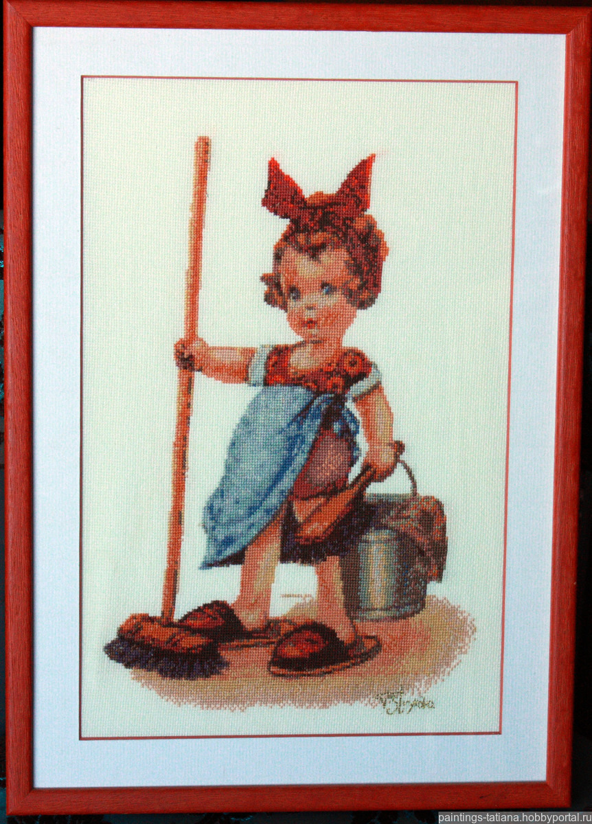 Репродукция рождественской открытки образца 1914 года, изображающая маленькую девочку в заботах большого дома.