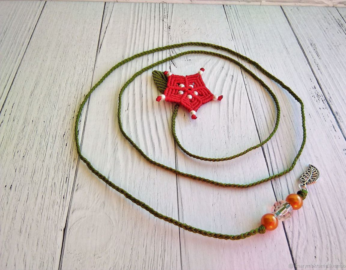 Диаметр цветка 4см, толщина плетеного шнура 3мм, длина плетенного шнура 85см (с листочком 87см)