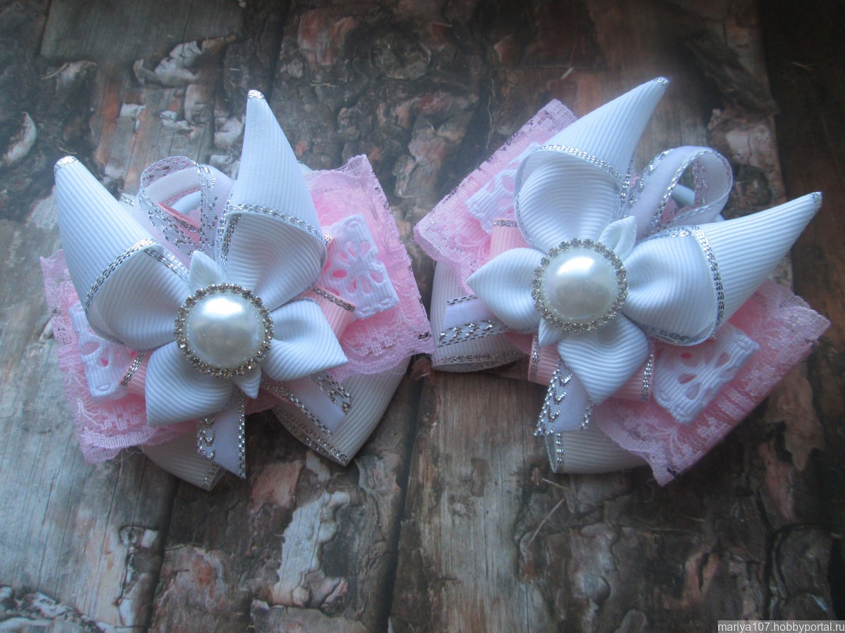 Заколки выполнены из репсовых лент, кружева и бархатной ленты. Размер примерно 9 см. Крепление-резинки.