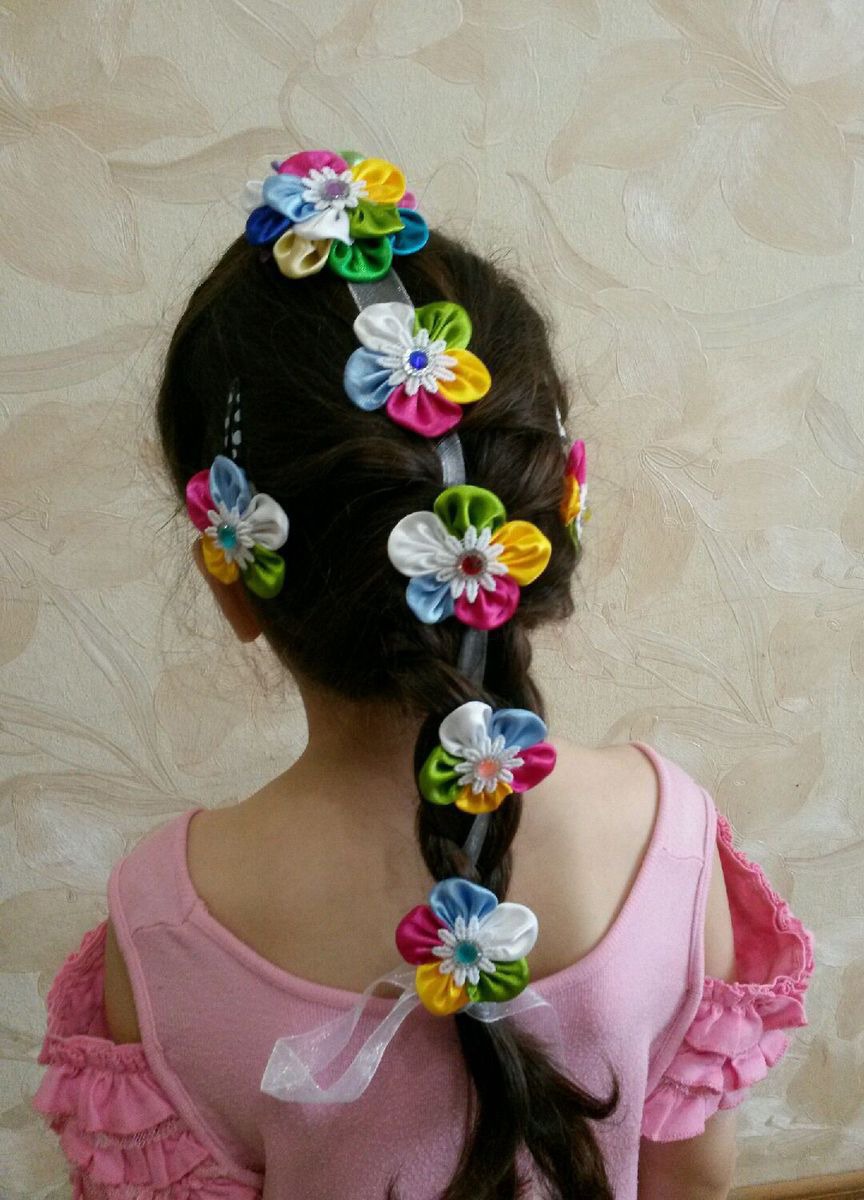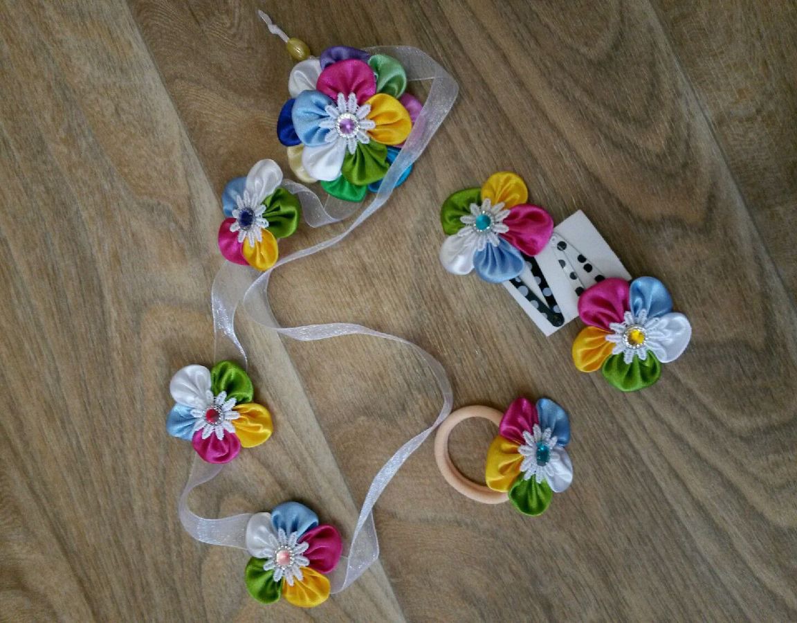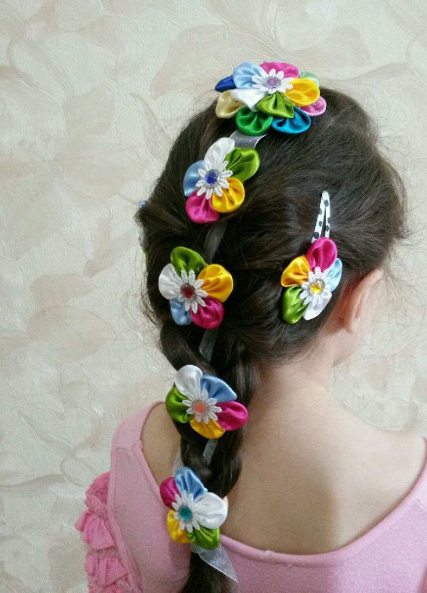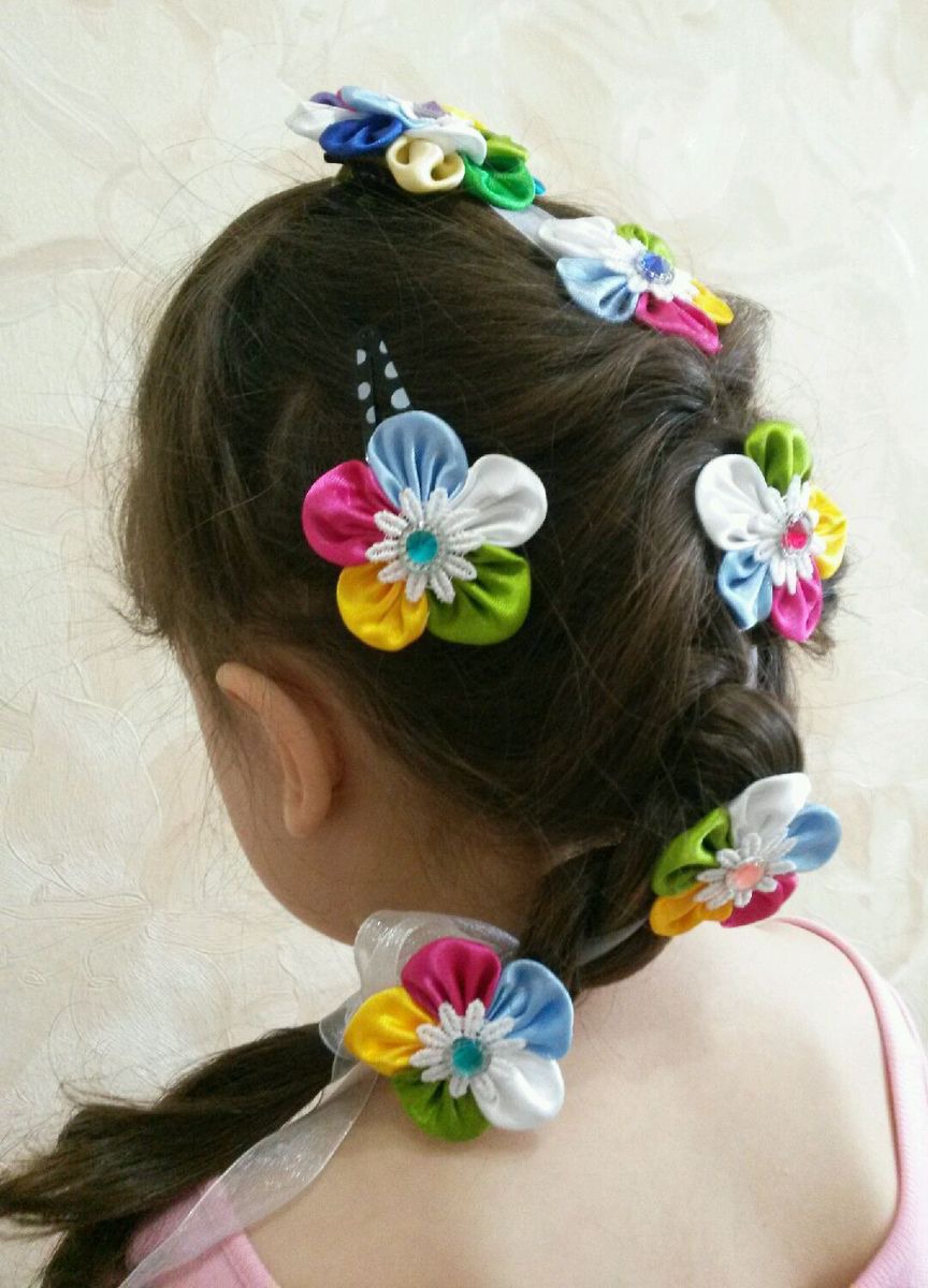 Радужная лента в косу с заколочками в комплекте украсят абсолютно любой наряд Вашей маленькой модницы! Для удобства последний цветочек сделан на резиночке,что очень удобно. Кроме того заколочки и эту резиночку можно носить как отдельный комплект украшений для волос.