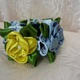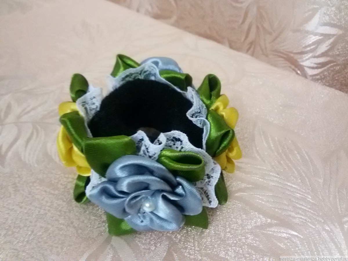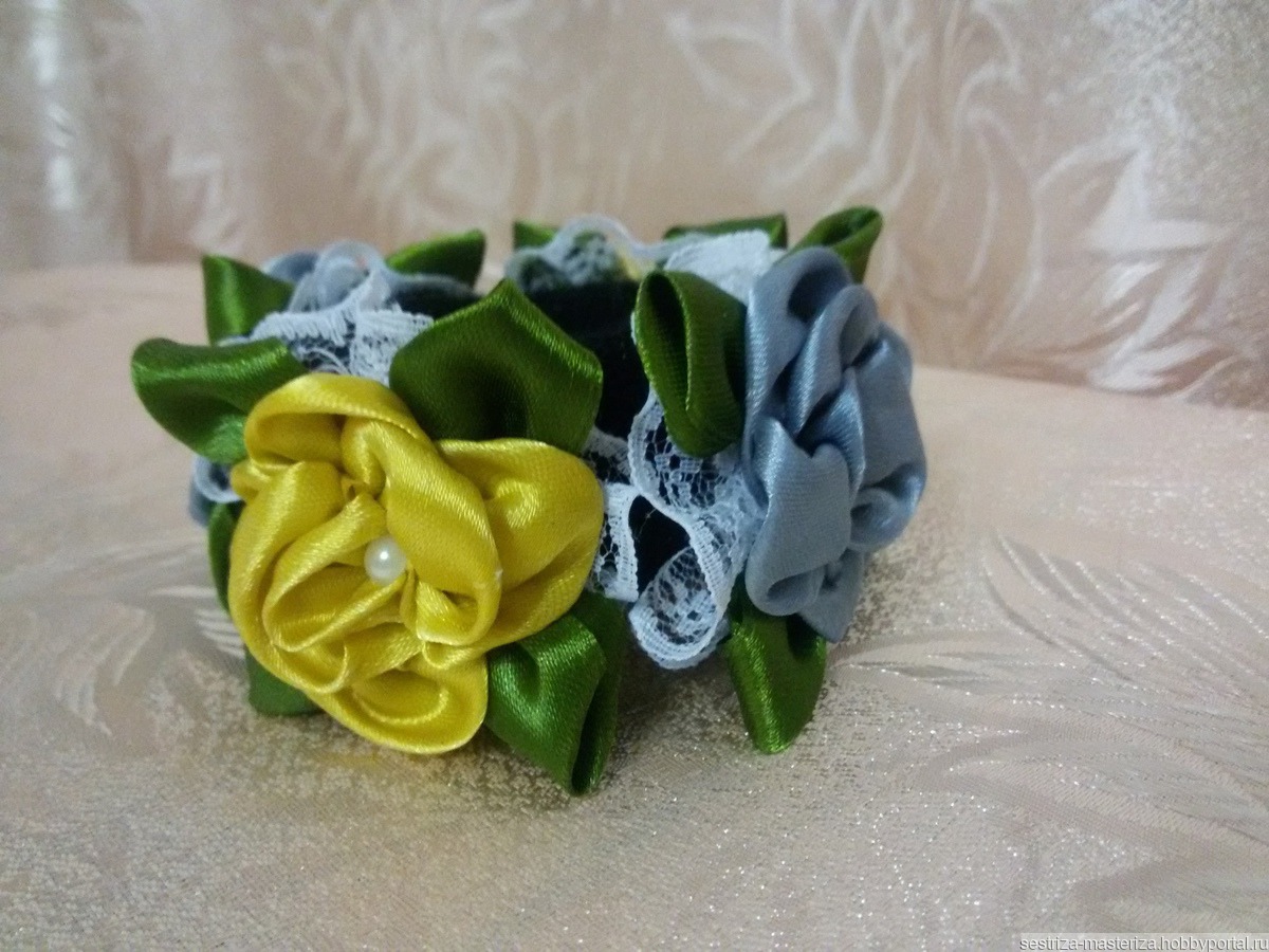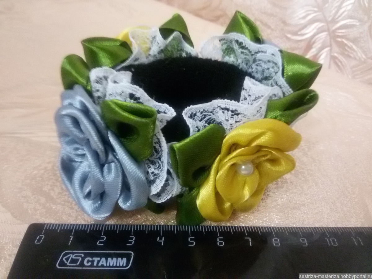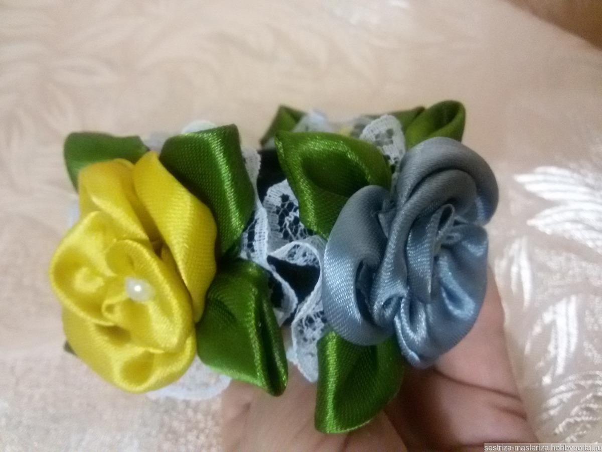 Резинка на пучок (черная широкая резинка)выполнена из серебристых и золотистых роз. Украшен бусинками и кружевом.