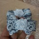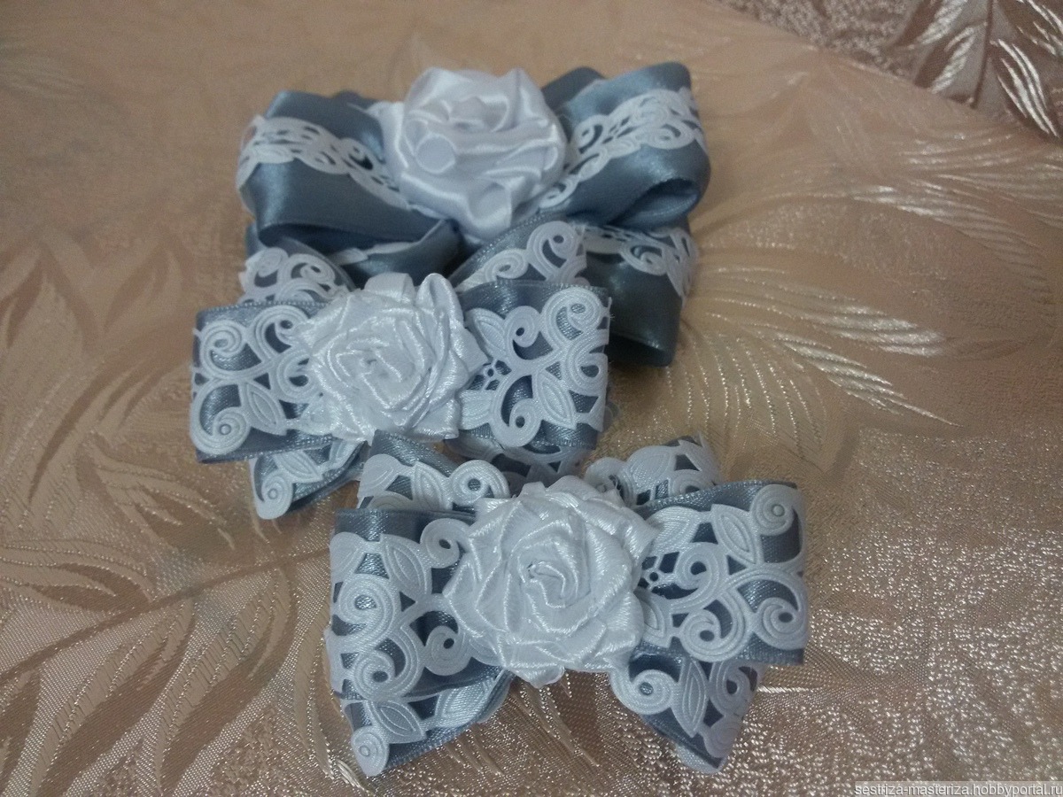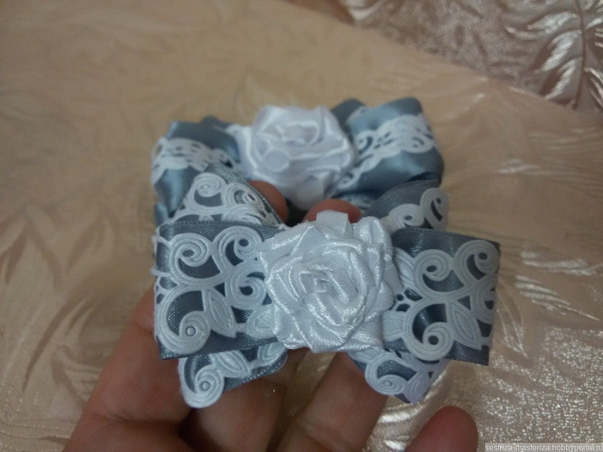 Изящный комплект серебристых бантиков с белой резной тесьмой украшают мини-розочки!