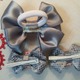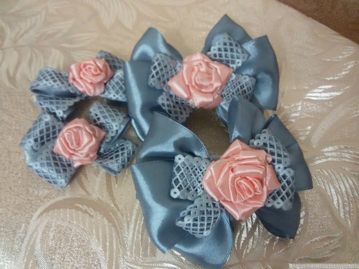 Изящный комплект состоит из большого бантика на резинке и двух небольших бантиков на заколках-"прищепках". (есть два варианта больших бантиков) Выполнен из серой серебристой атласной ленты, декоративной серебристой ленты, украшен розовыми мини-розочками и маленькой бусинкой под жемчуг.