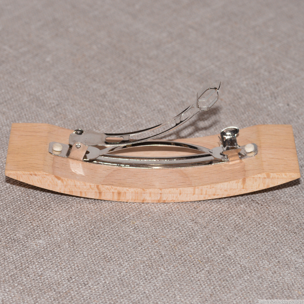 Вставки зашлифованы вровень (заподлицо) с основой. Размер зажима 8 см. Зажим закреплен на заколке двумя деревянными вставками и дополнительно приклеен. Размер самой заколки 108х35х19 мм. Поверхность отшлифована до 800 зернистости абразива, покрыта воском и отполирована.