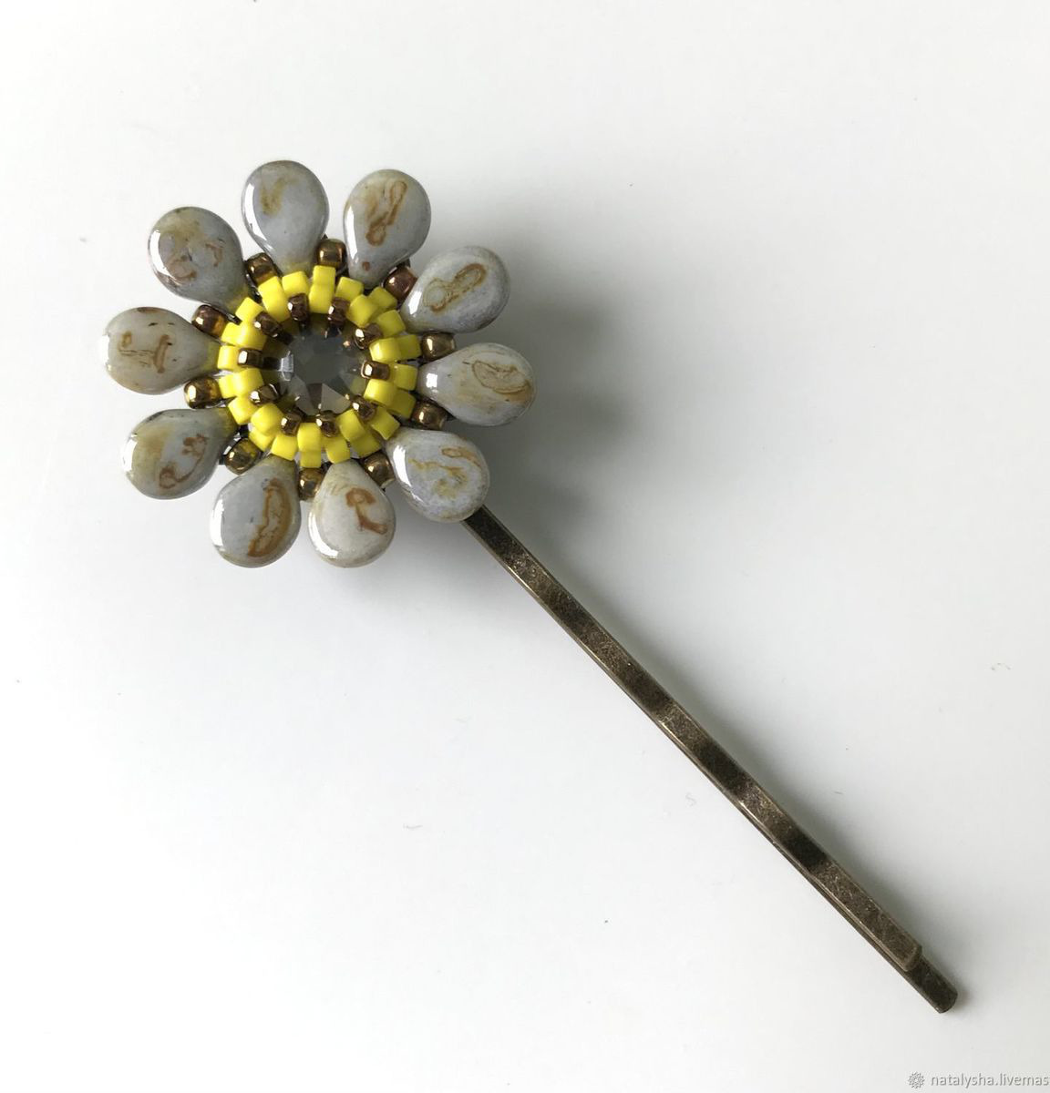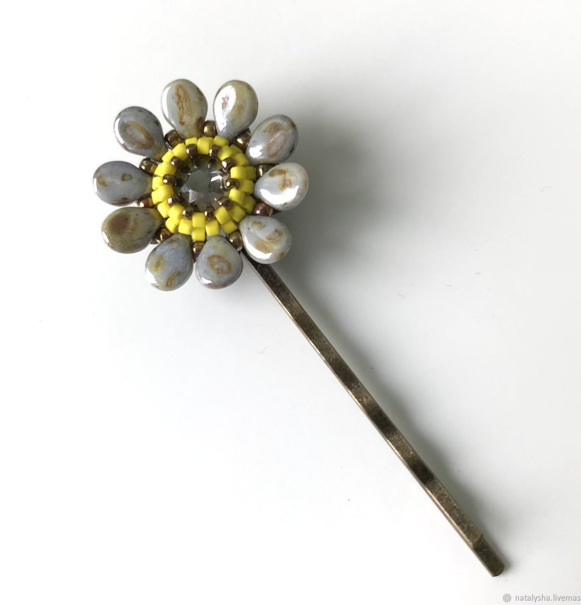 На первый взгляд заколки одинаковые, но у одной в оплётке глянцевый бисер (фото 4), а у другой - матовый в том же цвете (фото 5). Заколочки прекрасно смотрятся вместе, но по Вашему желанию могу сплести пару к каждому виду.