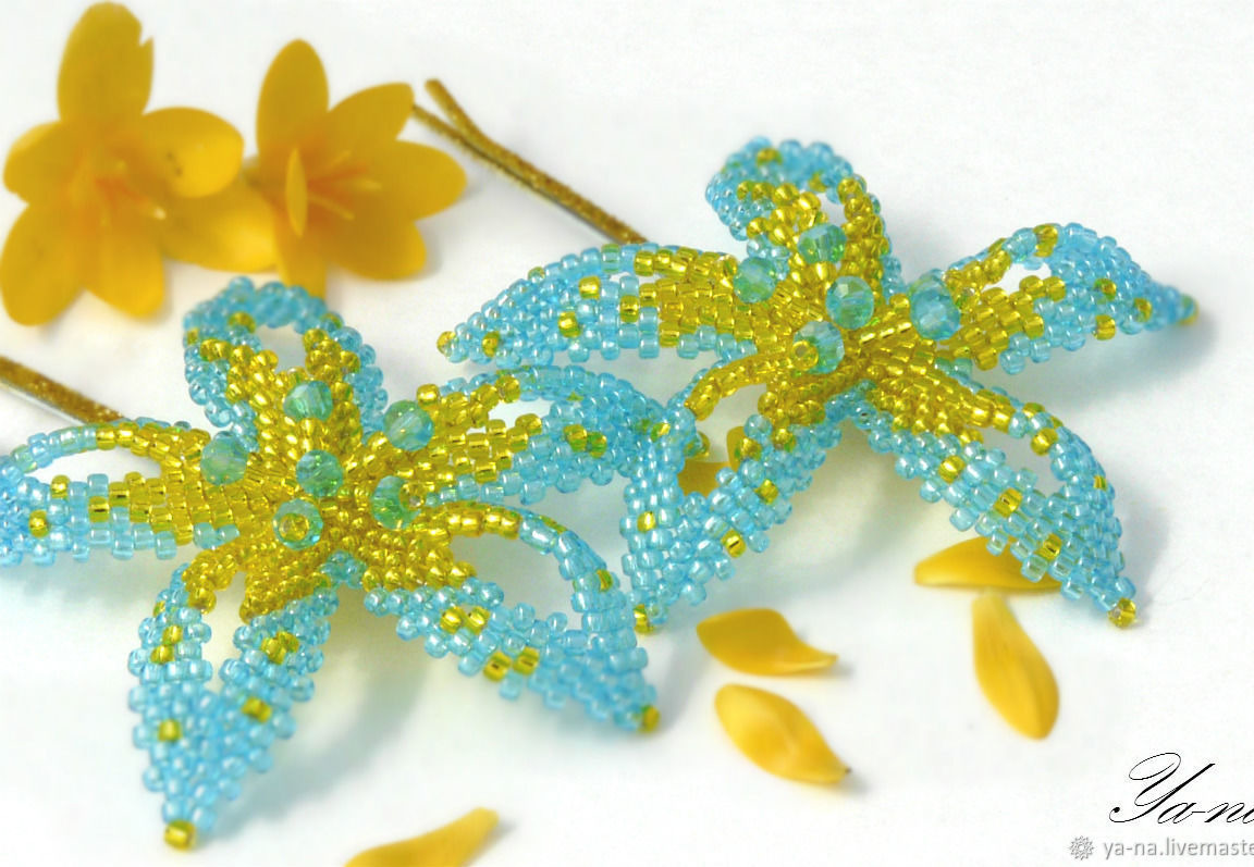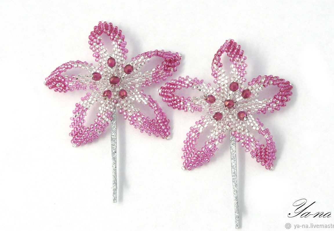 В работе использован японский бисер, чешские граненые бусины. Есть основы заколок разных цветов.