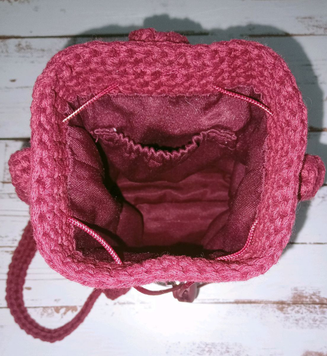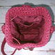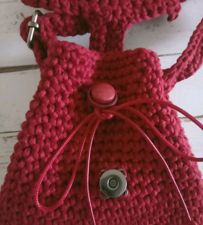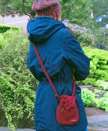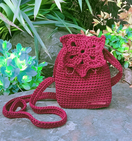 Маленькая летняя сумка-торба на длинном ремешке через плечо. Связана из хлопчатобумажного шнура, состав 80% хлопок, 20% полиэстер. Длина ремешка регулируется. Верх сумки затягивается на шнур с фиксатором. Украшена клапаном в виде кленового листа, застёгивается на магнитную кнопку. Внутри на подкладке с одним карманом.