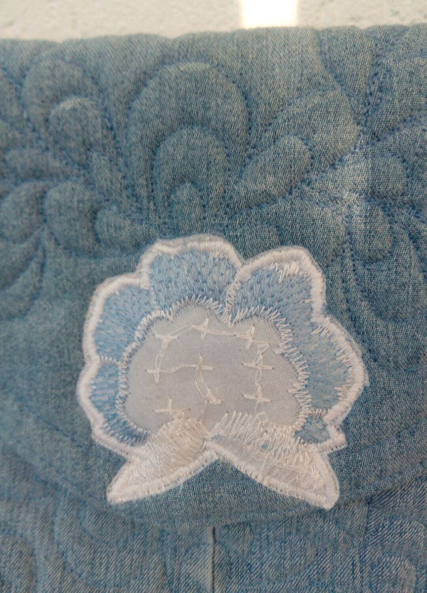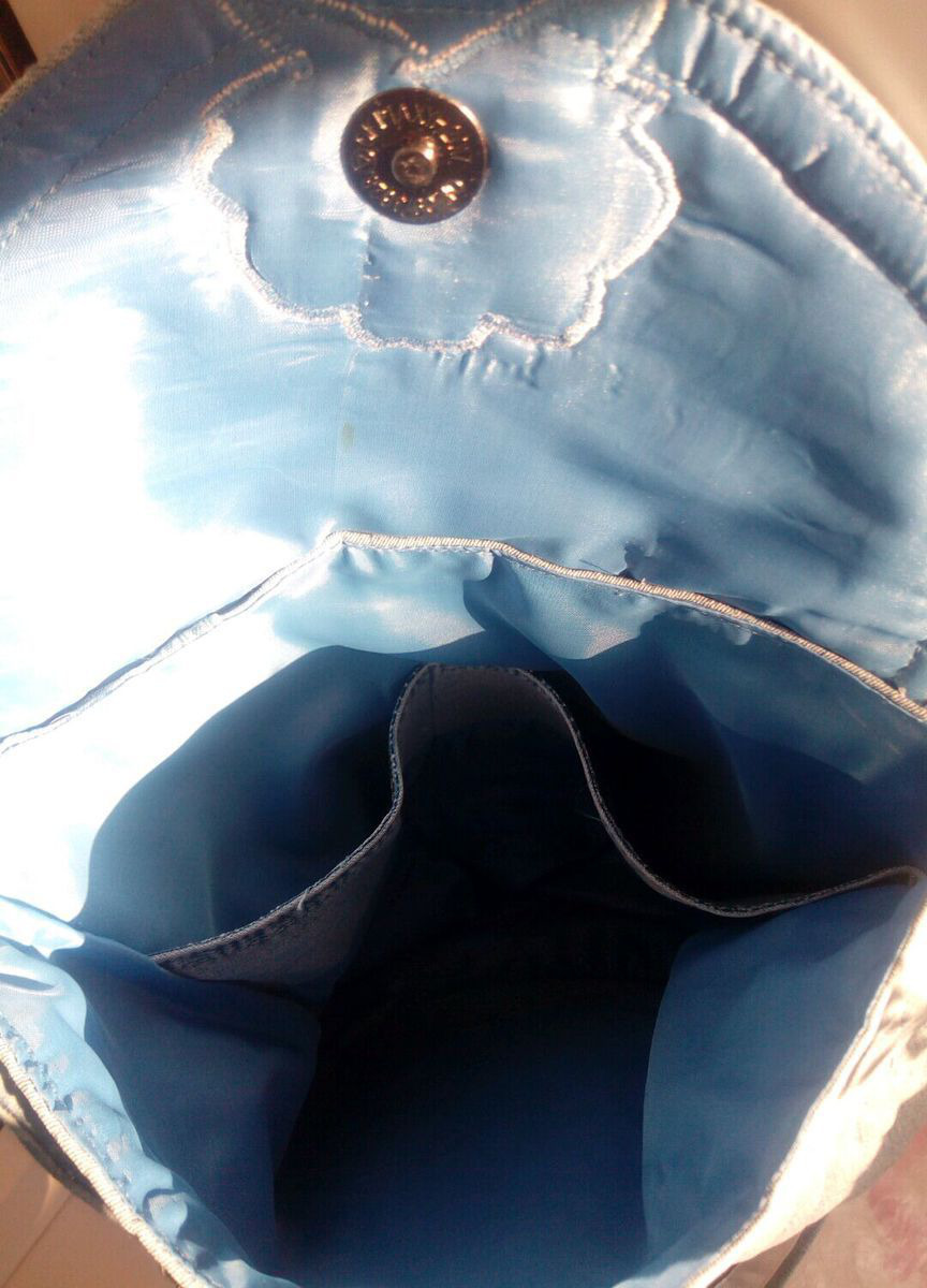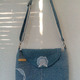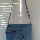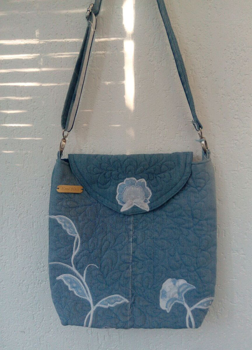 Джинсовая сумочка через плечо с регулируемым ремешком и клапаном. Украшена аппликацией и стежкой.Легкая, удобная, универсальная.Карман на молнии сзади и два внутренних кармана.Застегивается на магнитную кнопку