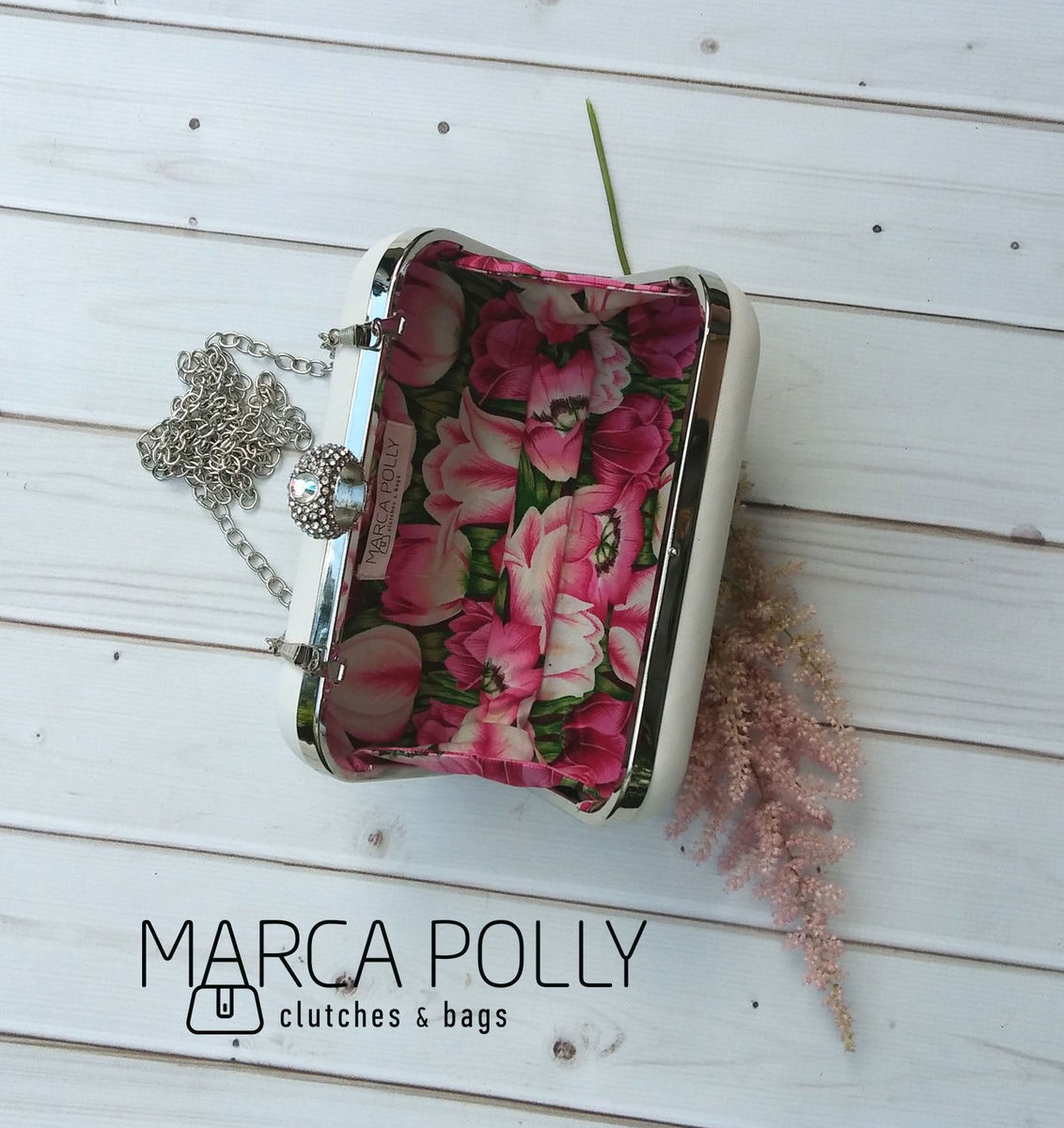 Клатч обтянутый натуральной итальянской кожей белого цвета. Подклад выполнен из 100 % американского хлопка в контраст с очень красивым рисунком. Изящная застежка в виде колечка помогает носить клатч в руке. Также в комплекте цепочка длинной 120 см.