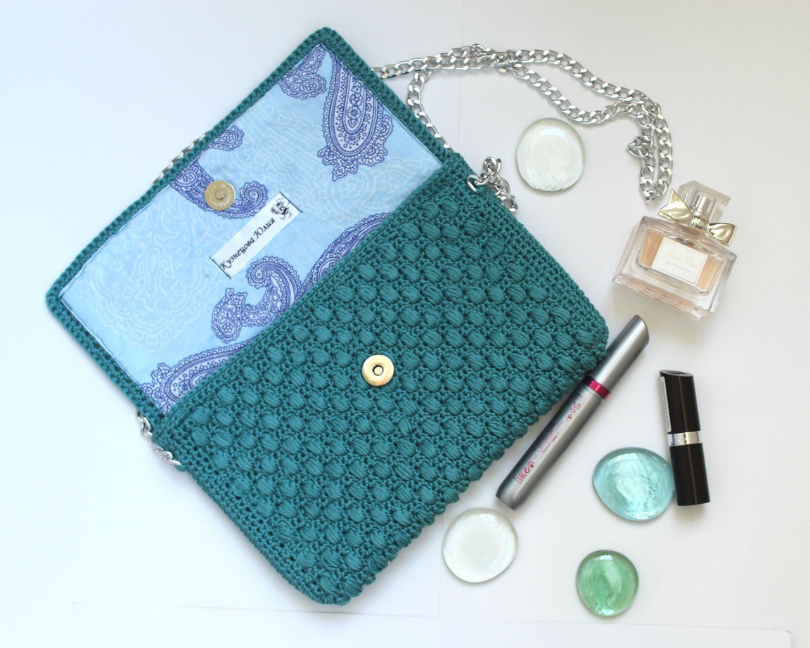 Клатч связан крючком из 100% хлопка. Размер 23 с на 16 см. Достаточно вместительный. Подклад выполнен из хлопка с флизелином для прочности. Ручка - металлическая цепочка. Длина достаточна для того, чтобы носить через плечо. Застежка магнитная. Форму держит хорошо.