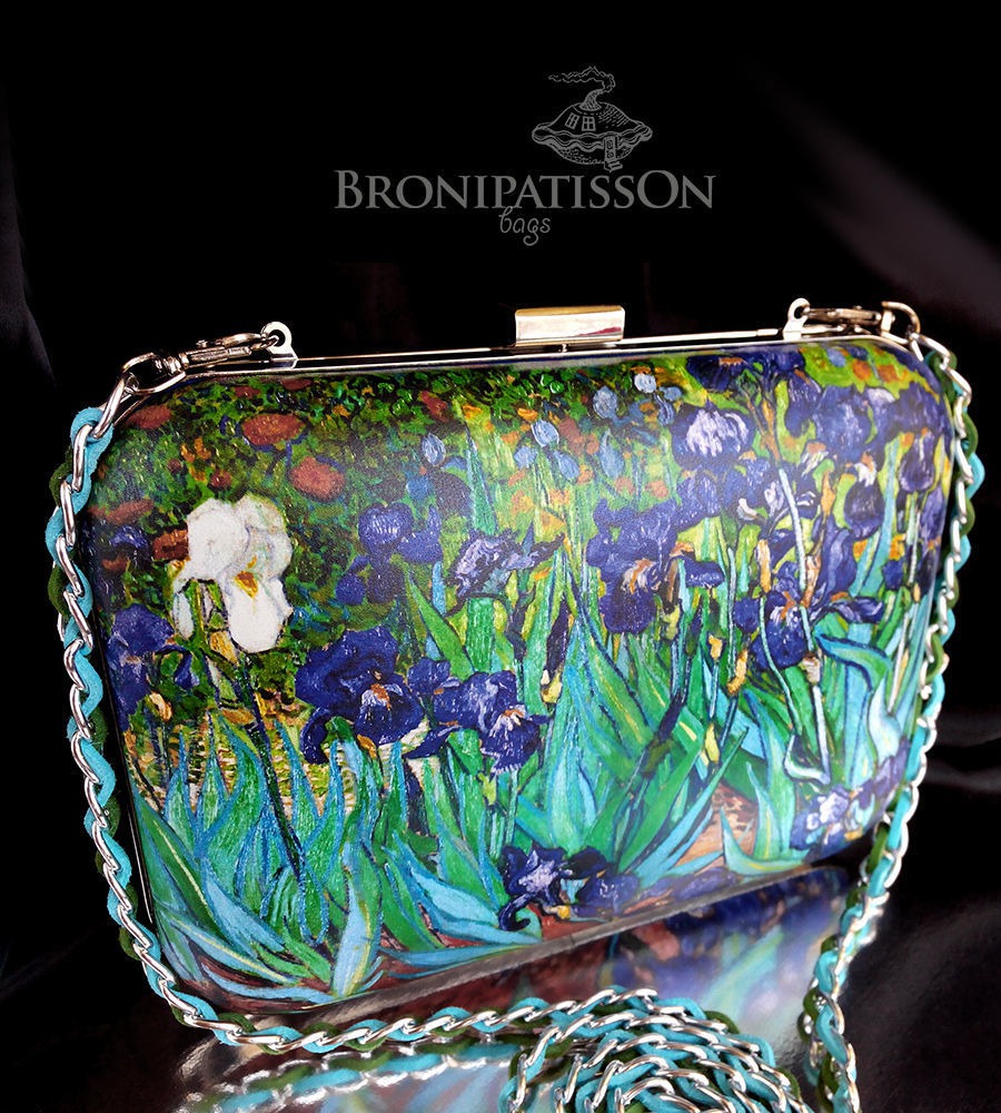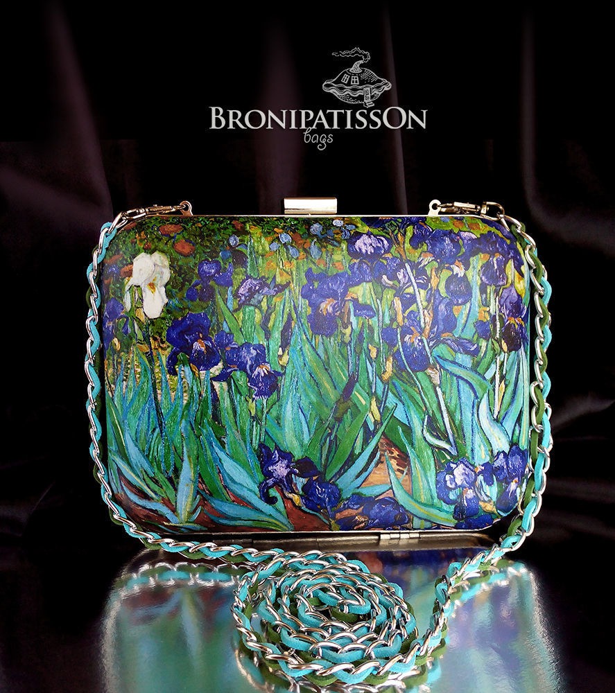 Этот достаточно крупный клатч выполнен из натуральной кожи с принтом. На принте изображена знаменитая картина Винсента Ван Гога "Ирисы".