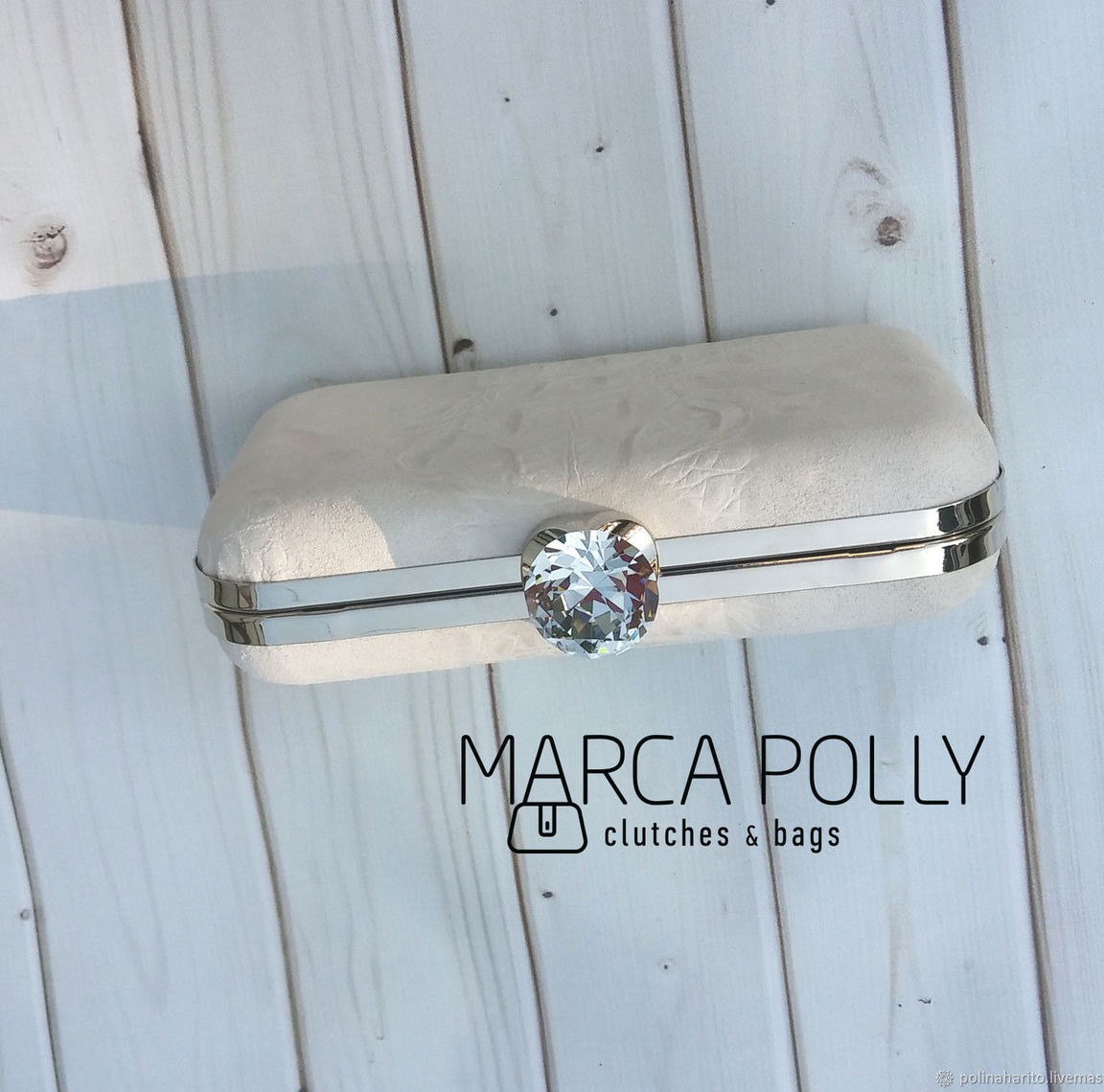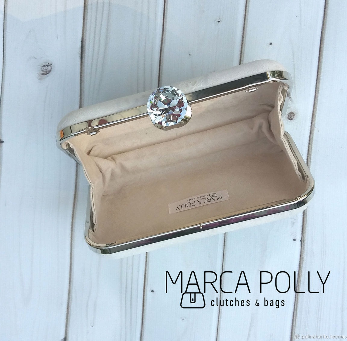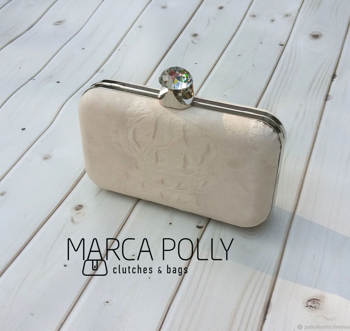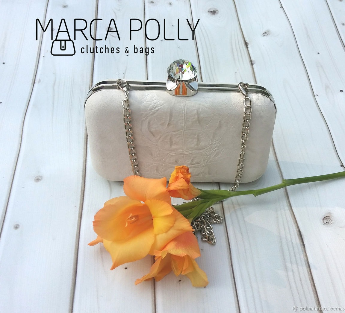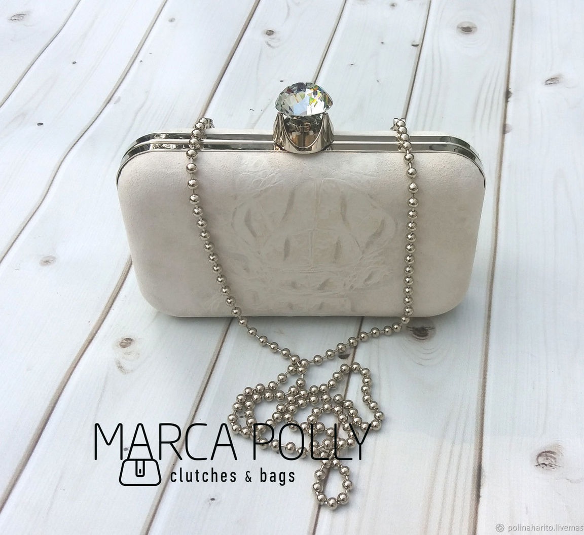 Невероятно красивый клатч! Клатч обтянут необычной итальянской замшей натурального белого цвета. На замше тиснение под крокодила. Клатч украшает очень красивая застежка с крупным камнем.